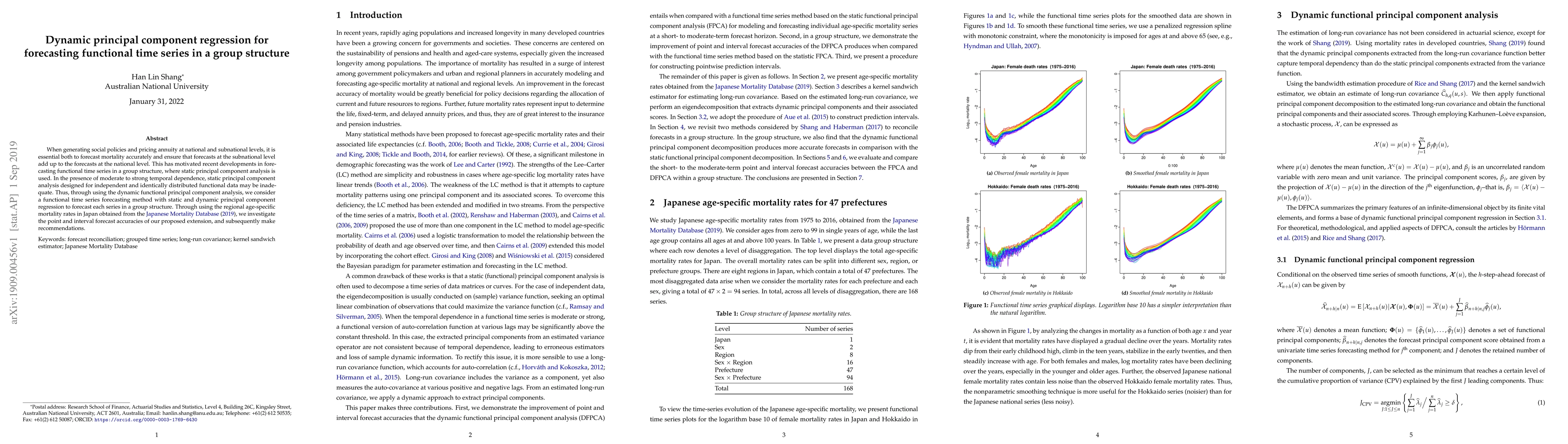 This paper proposes a dynamic principal component regression method for forecasting functional time series in a group structure, addressing the inadequacy of static PCA in the presence of temporal dependence. The method is tested using Japanese regional age-specific mortality rates to evaluate its forecast accuracy and make recommendations for social policy and annuity pricing.