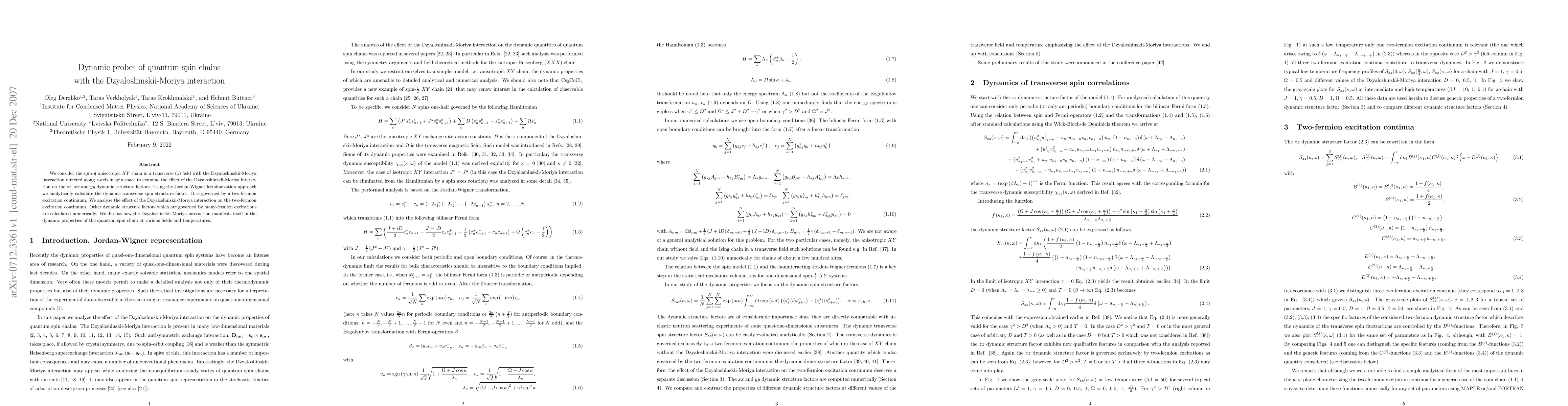 This paper investigates the spin-1/2 anisotropic XY chain under a transverse field with Dzyaloshinskii-Moriya interaction, calculating dynamic structure factors analytically and numerically. It highlights the impact of the Dzyaloshinskii-Moriya interaction on the two-fermion excitation continuum and many-fermion excitations, revealing its influence on the quantum spin chain's dynamic properties across different fields and temperatures.