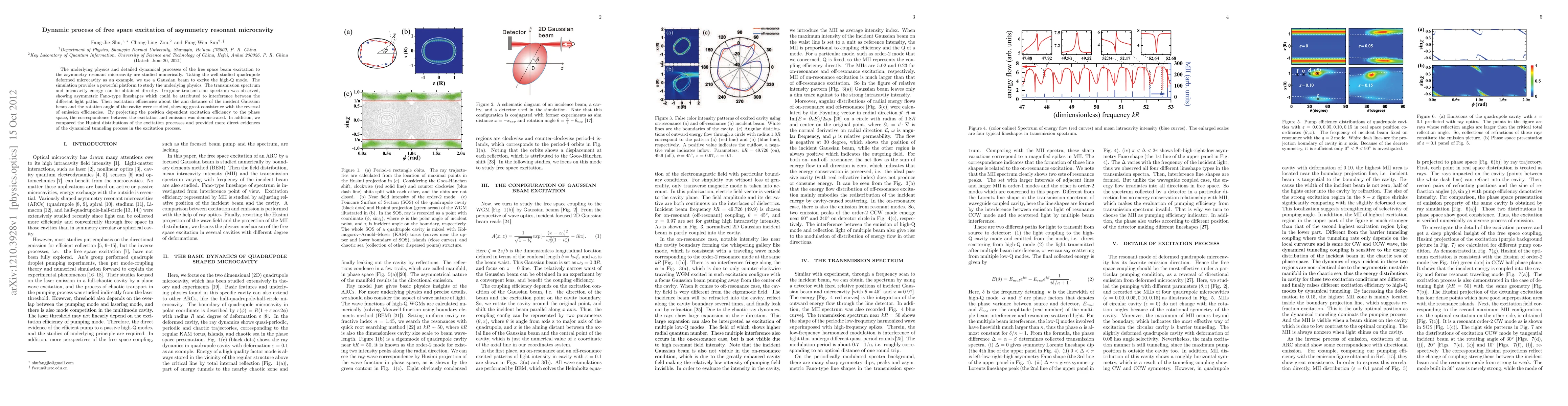This paper numerically investigates the dynamic processes of free space beam excitation in an asymmetry resonant microcavity, using a quadrupole-deformed microcavity as a case study. The study reveals irregular transmission spectra with asymmetric Fano-type lineshapes due to interference, and demonstrates the correspondence between excitation and emission efficiencies through phase space analysis.