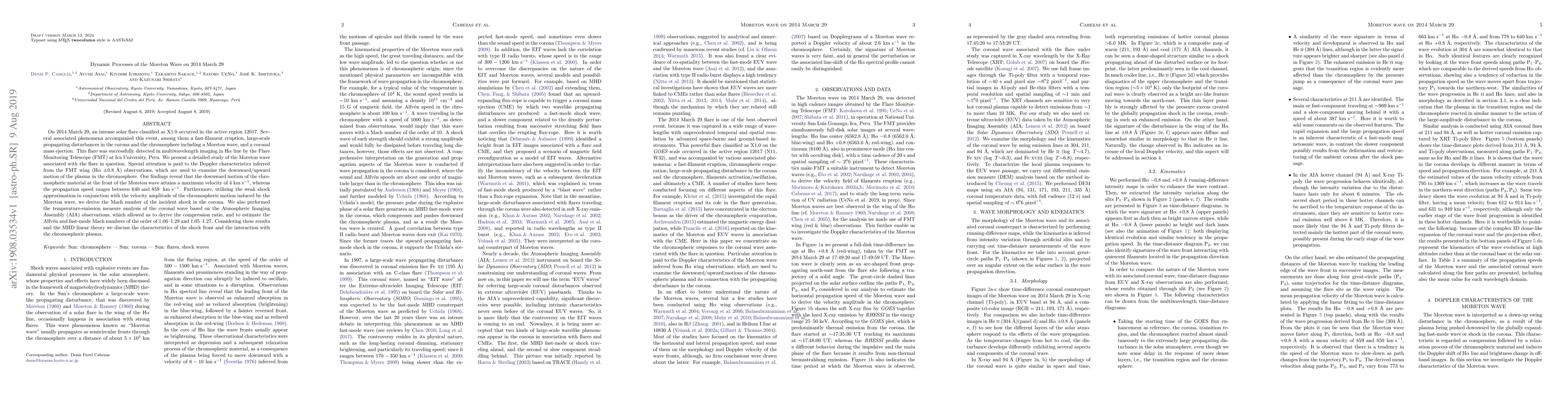 On 2014 March 29, an intense solar flare classified as X1.0 occurred in the active region 12017. Several associated phenomena accompanied this event, among them a fast-filament eruption, large-scale propagating disturbances in the corona and the chromosphere including a Moreton wave, and a coronal mass ejection. This flare was successfully detected in multiwavelength imaging in H-alpha line by the Flare Monitoring Telescope (FMT) at Ica University, Peru. We present a detailed study of the Moreton wave associated with the flare in question. Special attention is paid to the Doppler characteristics inferred from the FMT wing (H-alpha$\pm0.8$~{\AA}) observations, which are used to examine the downward/upward motion of the plasma in the chromosphere. Our findings reveal that the downward motion of the chromospheric material at the front of the Moreton wave attains a maximum velocity of 4 km/s, whereas the propagation speed ranges between 640 and 859 km/s. Furthermore, utilizing the weak shock approximation in conjunction with the velocity amplitude of the chromospheric motion induced by the Moreton wave, we derive the Mach number of the incident shock in the corona. We also performed the temperature-emission measure analysis of the coronal wave based on the Atmospheric Imaging Assembly (AIA) observations, which allowed us to derive the compression ratio, and to estimate the Alfv\'en and fast-mode Mach numbers of the order of 1.06-1.28 and 1.05-1.27. Considering these results and the MHD linear theory we discuss the characteristics of the shock front and the interaction with the chromospheric plasma.