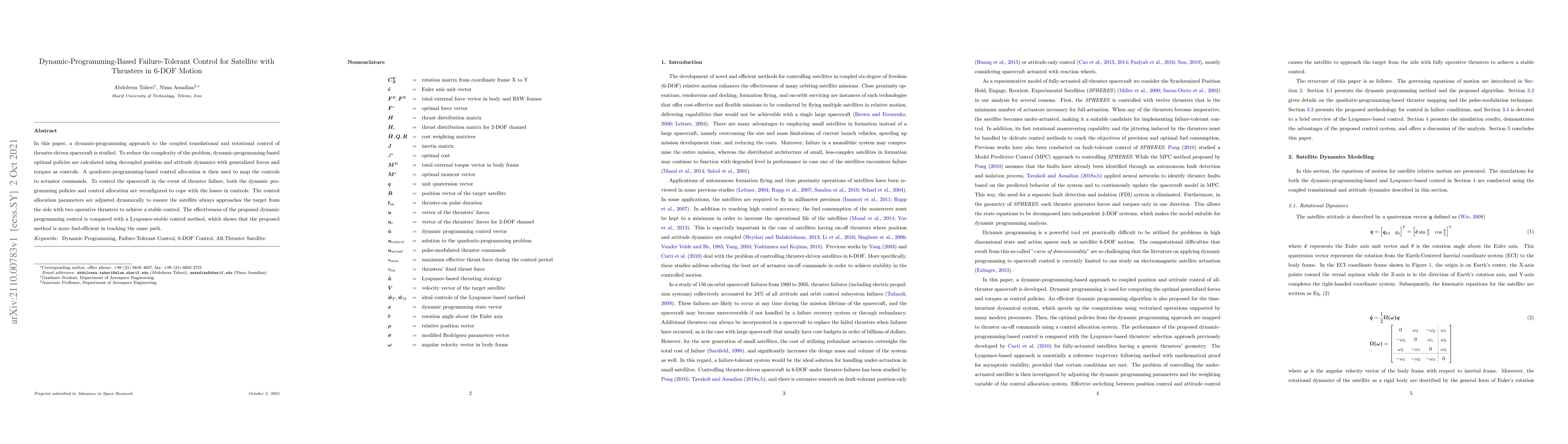 In this paper, a dynamic-programming approach to the coupled translational and rotational control of thruster-driven spacecraft is studied. To reduce the complexity of the problem, dynamic-programming-based optimal policies are calculated using decoupled position and attitude dynamics with generalized forces and torques as controls. A quadratic-programming-based control allocation is then used to map the controls to actuator commands. To control the spacecraft in the event of thruster failure, both the dynamic programming policies and control allocation are reconfigured to cope with the losses in controls. The control allocation parameters are adjusted dynamically to ensure the satellite always approaches the target from the side with two operative thrusters to achieve a stable control. The effectiveness of the proposed dynamic programming control is compared with a Lyapunov-stable control method, which shows that the proposed method is more fuel-efficient in tracking the same path.