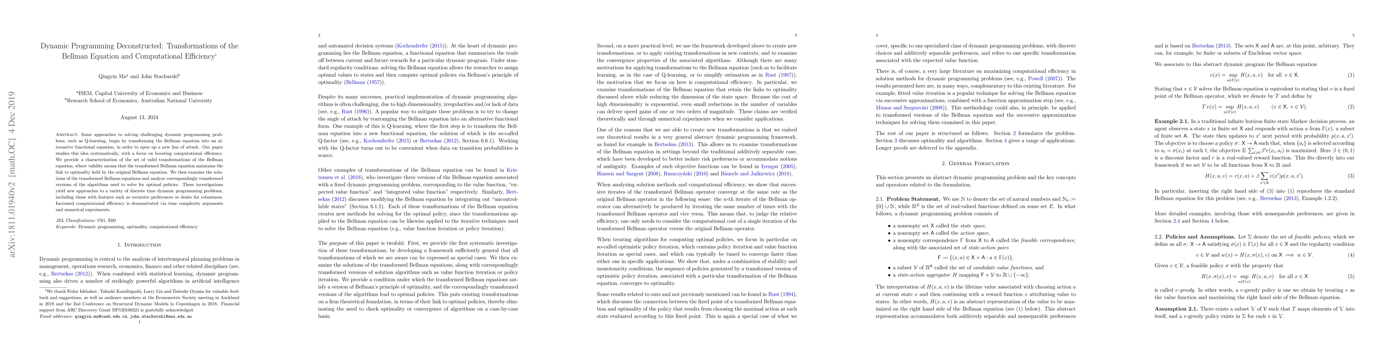 Some approaches to solving challenging dynamic programming problems, such as Q-learning, begin by transforming the Bellman equation into an alternative functional equation, in order to open up a new line of attack. Our paper studies this idea systematically, with a focus on boosting computational efficiency. We provide a characterization of the set of valid transformations of the Bellman equation, where validity means that the transformed Bellman equation maintains the link to optimality held by the original Bellman equation. We then examine the solutions of the transformed Bellman equations and analyze correspondingly transformed versions of the algorithms used to solve for optimal policies. These investigations yield new approaches to a variety of discrete time dynamic programming problems, including those with features such as recursive preferences or desire for robustness. Increased computational efficiency is demonstrated via time complexity arguments and numerical experiments.