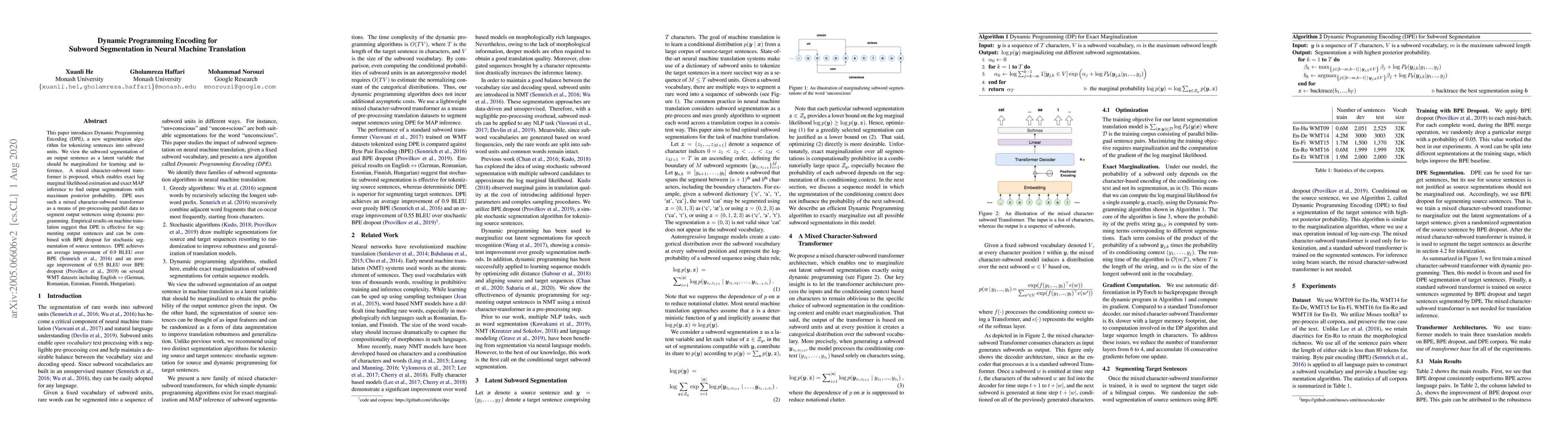 This paper proposes Dynamic Programming Encoding (DPE) for subword segmentation in neural machine translation, achieving better BLEU scores compared to BPE and BPE dropout. DPE leverages a mixed character-subword transformer for exact log marginal likelihood estimation and MAP inference.