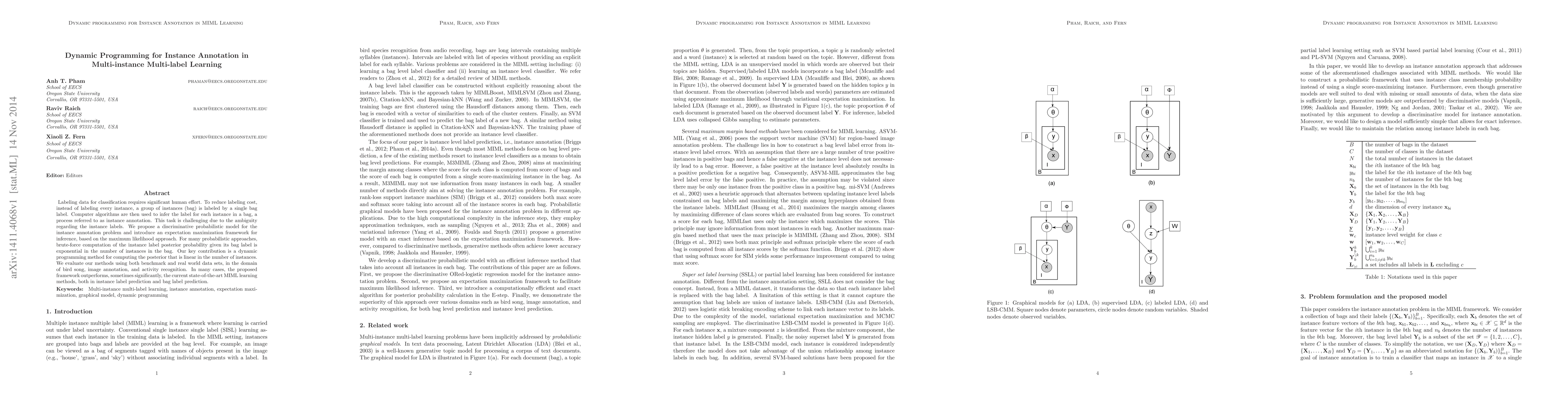 Labeling data for classification requires significant human effort. To reduce labeling cost, instead of labeling every instance, a group of instances (bag) is labeled by a single bag label. Computer algorithms are then used to infer the label for each instance in a bag, a process referred to as instance annotation. This task is challenging due to the ambiguity regarding the instance labels. We propose a discriminative probabilistic model for the instance annotation problem and introduce an expectation maximization framework for inference, based on the maximum likelihood approach. For many probabilistic approaches, brute-force computation of the instance label posterior probability given its bag label is exponential in the number of instances in the bag. Our key contribution is a dynamic programming method for computing the posterior that is linear in the number of instances. We evaluate our methods using both benchmark and real world data sets, in the domain of bird song, image annotation, and activity recognition. In many cases, the proposed framework outperforms, sometimes significantly, the current state-of-the-art MIML learning methods, both in instance label prediction and bag label prediction.