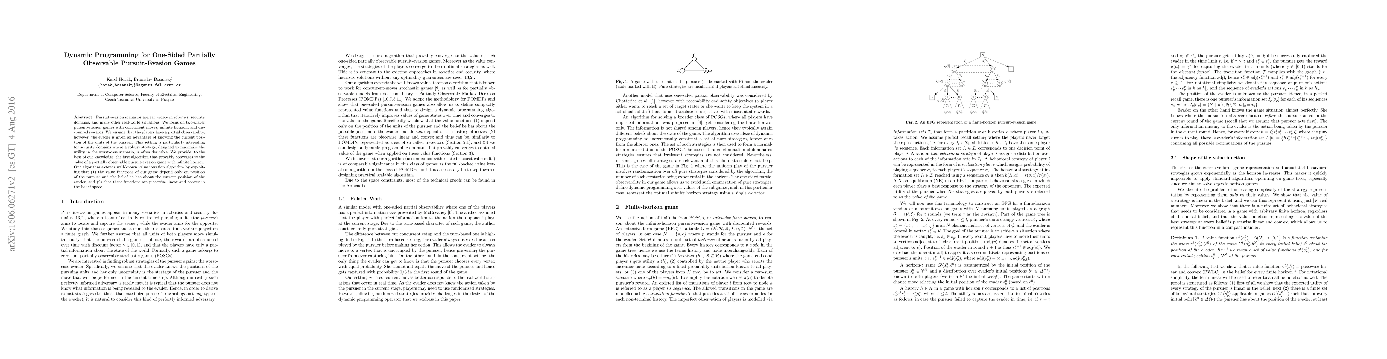 This paper presents a dynamic programming algorithm for solving one-sided partially observable pursuit-evasion games with infinite horizon and discounted rewards. The algorithm leverages value iteration and exploits the game's piecewise linear and convex properties to converge to the optimal strategy under partial observability.