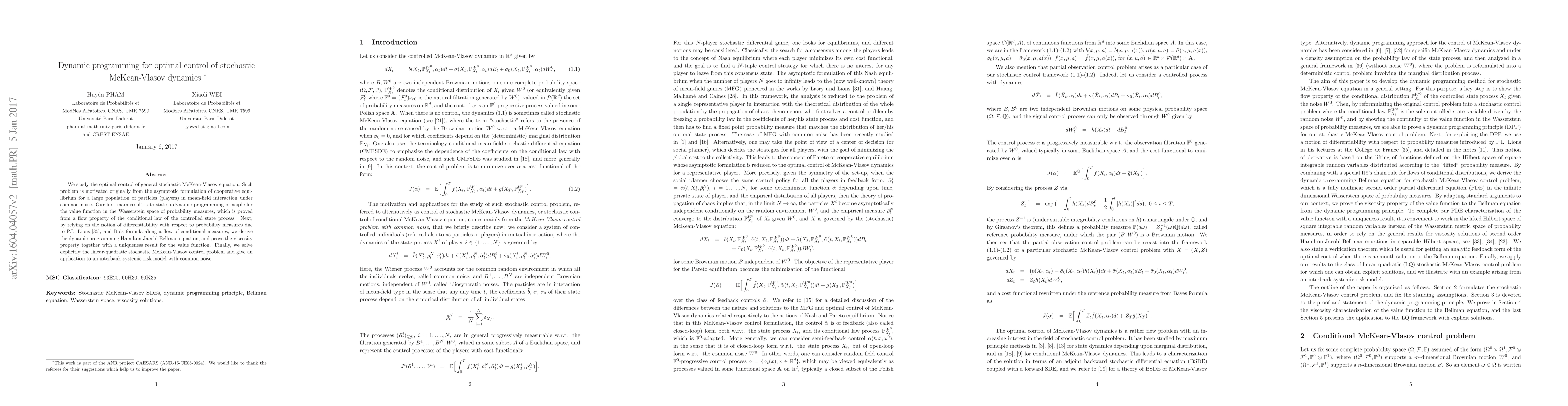 This paper develops a dynamic programming principle for optimal control of stochastic McKean-Vlasov dynamics, proving a Hamilton-Jacobi-Bellman equation and solving a linear-quadratic control problem, with an application to an interbank systemic risk model.