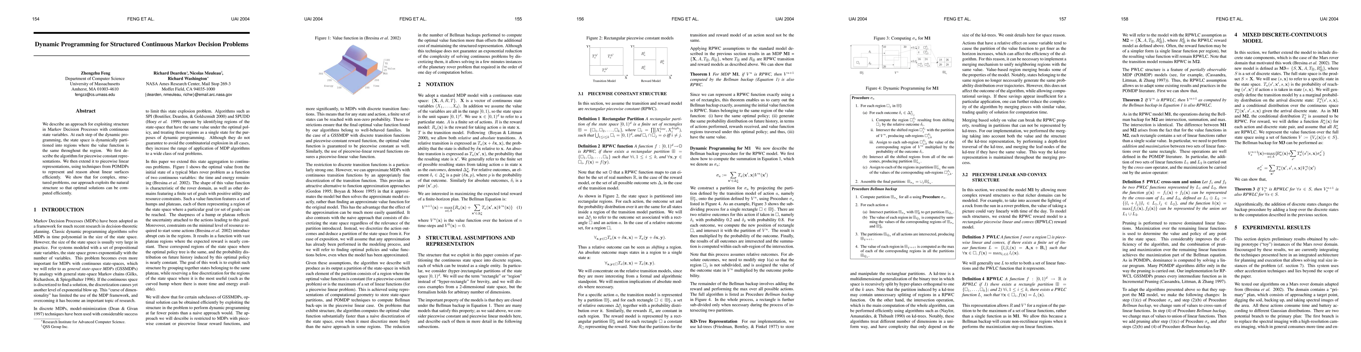 This paper proposes a dynamic programming method for structured continuous Markov Decision Processes, utilizing dynamic partitioning of the state space into regions with uniform value functions, and extending from piecewise constant to piecewise linear representations to efficiently compute optimal solutions. The approach leverages natural problem structure to enhance computational efficiency.