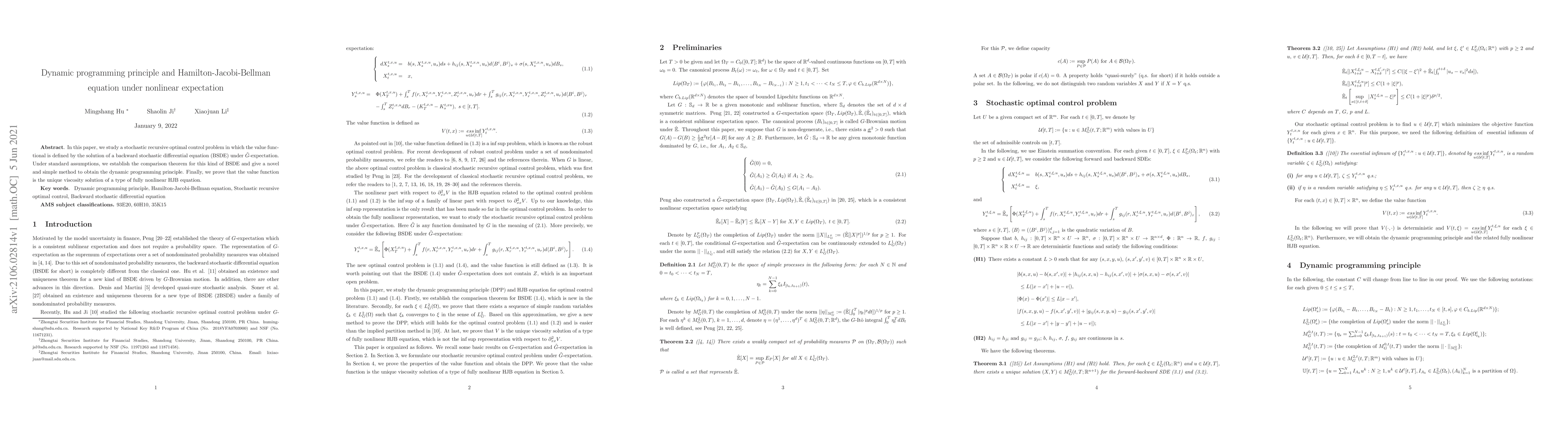 This paper investigates a stochastic optimal control problem under nonlinear expectation, establishing a comparison theorem for backward stochastic differential equations (BSDE) under $\tilde{G}$-expectation. The study derives a dynamic programming principle and proves the value function is the unique viscosity solution of a fully nonlinear Hamilton-Jacobi-Bellman (HJB) equation.