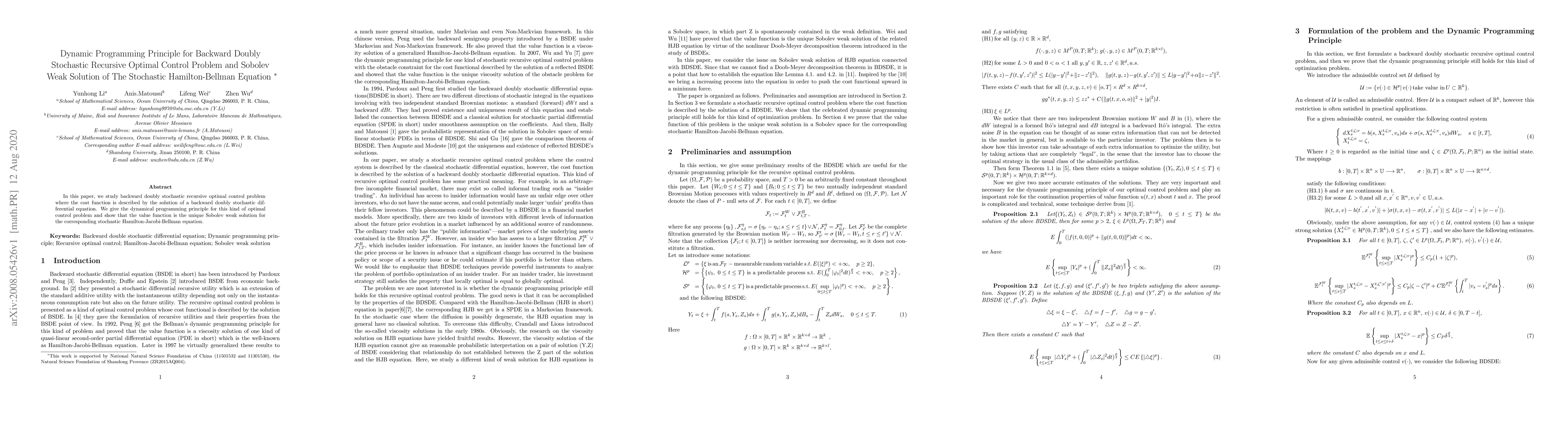 This paper presents a dynamic programming principle for a backward doubly stochastic recursive optimal control problem, demonstrating that the value function is the unique Sobolev weak solution to the associated stochastic Hamilton-Jacobi-Bellman equation.