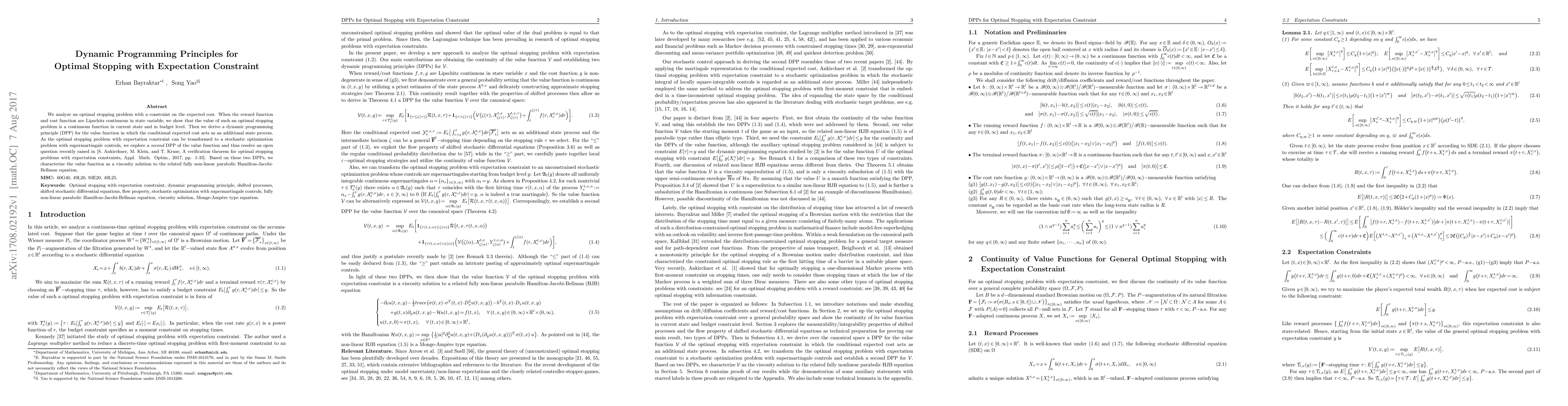 We analyze an optimal stopping problem with a constraint on the expected cost. When the reward function and cost function are Lipschitz continuous in state variable, we show that the value of such an optimal stopping problem is a continuous function in current state and in budget level. Then we derive a dynamic programming principle (DPP) for the value function in which the conditional expected cost acts as an additional state process. As the optimal stopping problem with expectation constraint can be transformed to a stochastic optimization problem with supermartingale controls, we explore a second DPP of the value function and thus resolve an open question recently raised in [S. Ankirchner, M. Klein, and T. Kruse, A verification theorem for optimal stopping problems with expectation constraints, Appl. Math. Optim., 2017, pp. 1-33]. Based on these two DPPs, we characterize the value function as a viscosity solution to the related fully non-linear parabolic Hamilton-Jacobi-Bellman equation.