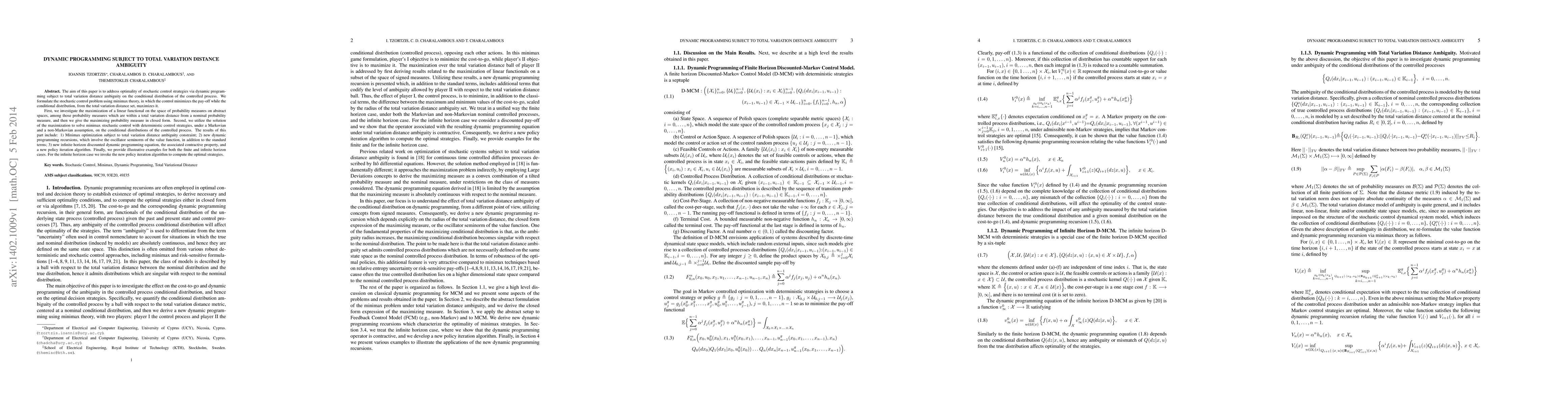 The aim of this paper is to address optimality of stochastic control strategies via dynamic programming subject to total variation distance ambiguity on the conditional distribution of the controlled process. We formulate the stochastic control problem using minimax theory, in which the control minimizes the pay-off while the conditional distribution, from the total variation distance set, maximizes it. First, we investigate the maximization of a linear functional on the space of probability measures on abstract spaces, among those probability measures which are within a total variation distance from a nominal probability measure, and then we give the maximizing probability measure in closed form. Second, we utilize the solution of the maximization to solve minimax stochastic control with deterministic control strategies, under a Markovian and a non-Markovian assumption, on the conditional distributions of the controlled process. The results of this part include: 1) Minimax optimization subject to total variation distance ambiguity constraint; 2) new dynamic programming recursions, which involve the oscillator seminorm of the value function, in addition to the standard terms; 3) new infinite horizon discounted dynamic programming equation, the associated contractive property, and a new policy iteration algorithm. Finally, we provide illustrative examples for both the finite and infinite horizon cases. For the infinite horizon case we invoke the new policy iteration algorithm to compute the optimal strategies.