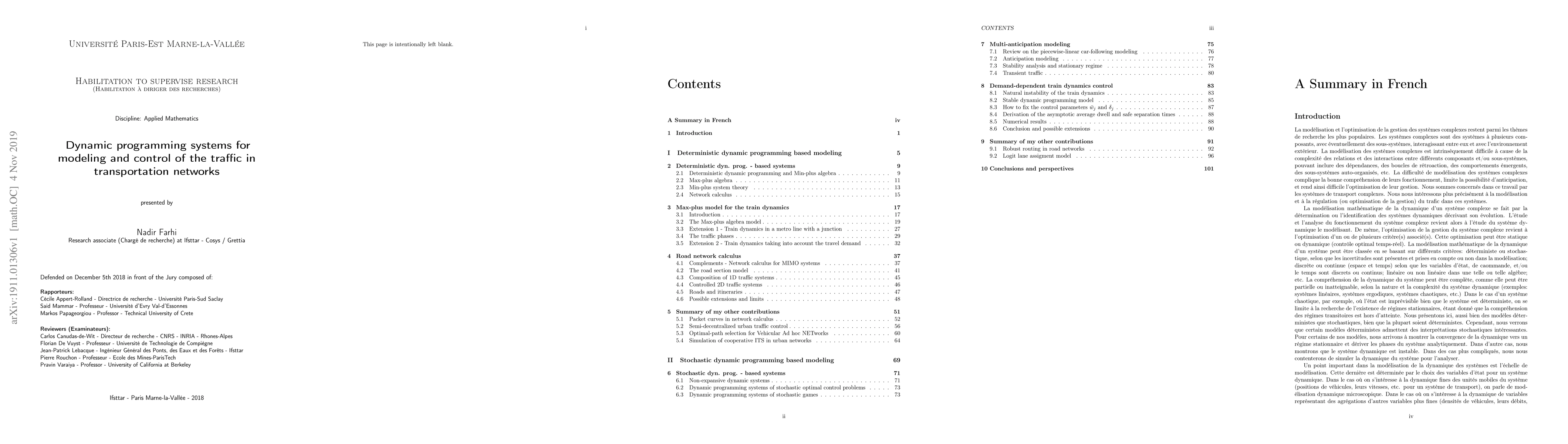 This research explores dynamic programming systems for traffic modeling and control in transportation networks, focusing on deterministic and stochastic dynamic programming approaches. It includes methods based on min-plus/max-plus algebra and non-linear models considering passenger demand and anticipation in driving.