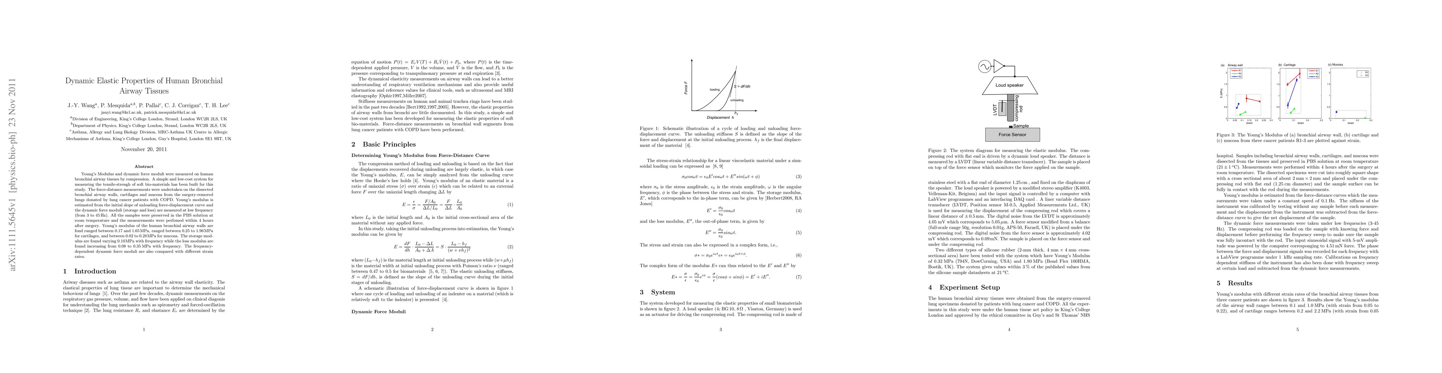 Young's Modulus and dynamic force moduli were measured on human bronchial airway tissues by compression. A simple and low-cost system for measuring the tensile-strengh of soft bio-materials has been built for this study. The force-distance measurements were undertaken on the dissected bronchial airway walls, cartilages and mucosa from the surgery-removed lungs donated by lung cancer patients with COPD. Young's modulus is estimated from the initial slope of unloading force-displacement curve and the dynamic force moduli (storage and loss) are measured at low frequency (from 3 to 45 Hz). All the samples were preserved in the PBS solution at room temperature and the measurements were perfomed within 4 hours after surgery. Young's modulus of the human bronchial airway walls are fond ranged between 0.17 and 1.65 MPa, ranged between 0.25 to 1.96 MPa for cartilages, and between 0.02 to 0.28 MPa for mucosa. The storage modulus are found varying 0.10 MPa with frequency while the loss modulus are found increasing from 0.08 to 0.35 MPa with frequency. The frequency-dependent dynamic force moduli are also compared with different strain rates.