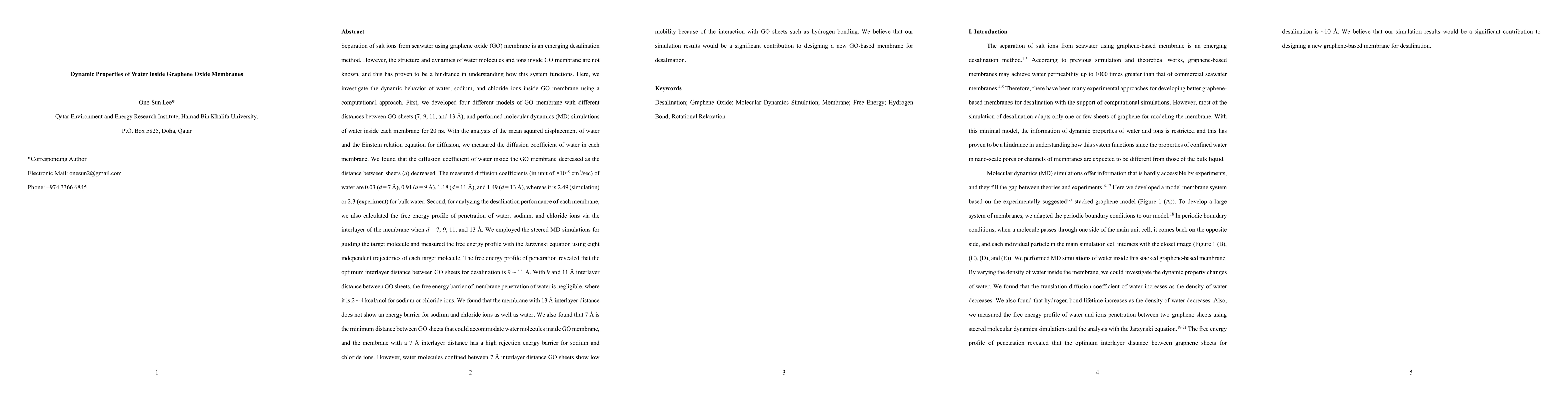 Researchers used computational modeling to study the movement of water and ions inside graphene oxide membranes, finding that the distance between GO sheets affects water diffusion and ion penetration, with optimal distances for desalination identified as 0.9-1.1 nm.