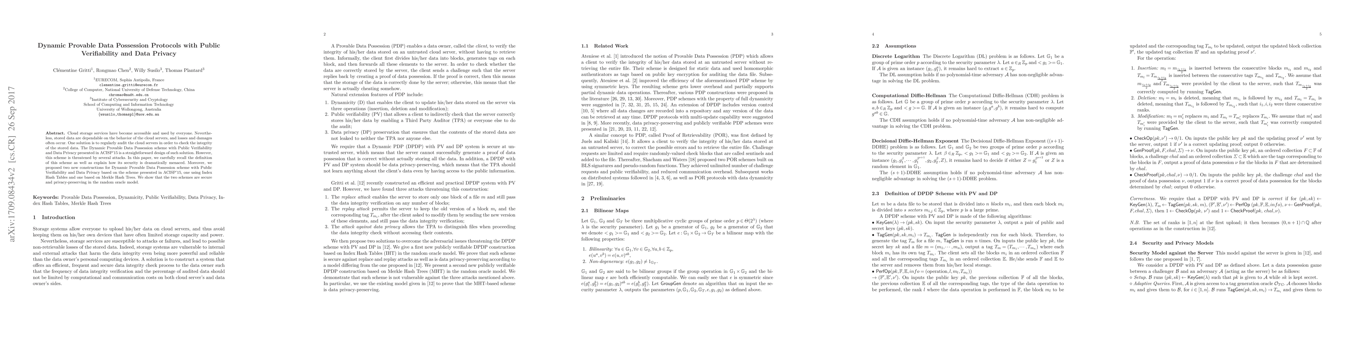 This paper proposes two new constructions for Dynamic Provable Data Possession schemes with Public Verifiability and Data Privacy, improving security against attacks and preserving data privacy.