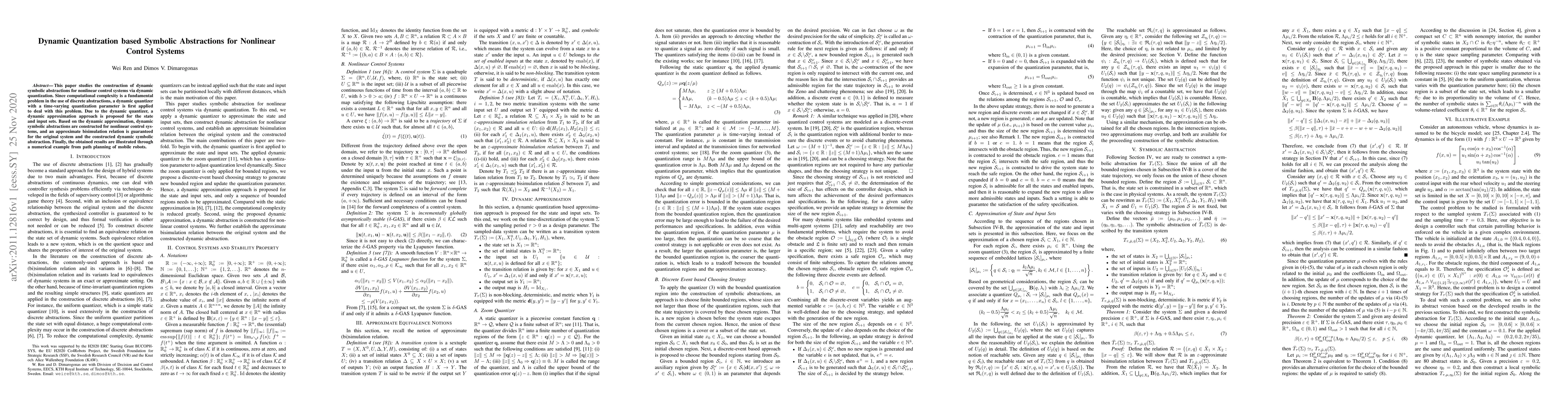 This paper proposes dynamic quantization-based symbolic abstractions for nonlinear control systems, addressing computational complexity through a time-varying quantizer. It constructs dynamic symbolic abstractions with an approximate bisimulation relation, demonstrated via a mobile robot path planning example.