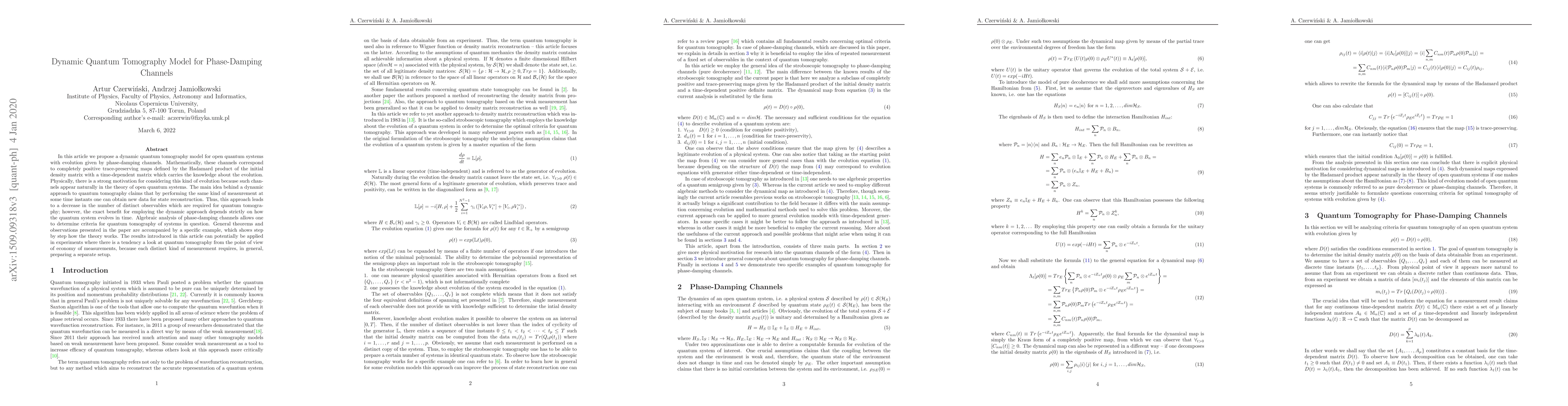 This paper proposes a dynamic quantum tomography model for open quantum systems evolving through phase-damping channels, aiming to reduce the number of required measurements for state reconstruction. The model leverages time-dependent matrices to optimize the tomography process, demonstrating its potential application in experiments requiring economical measurement setups.