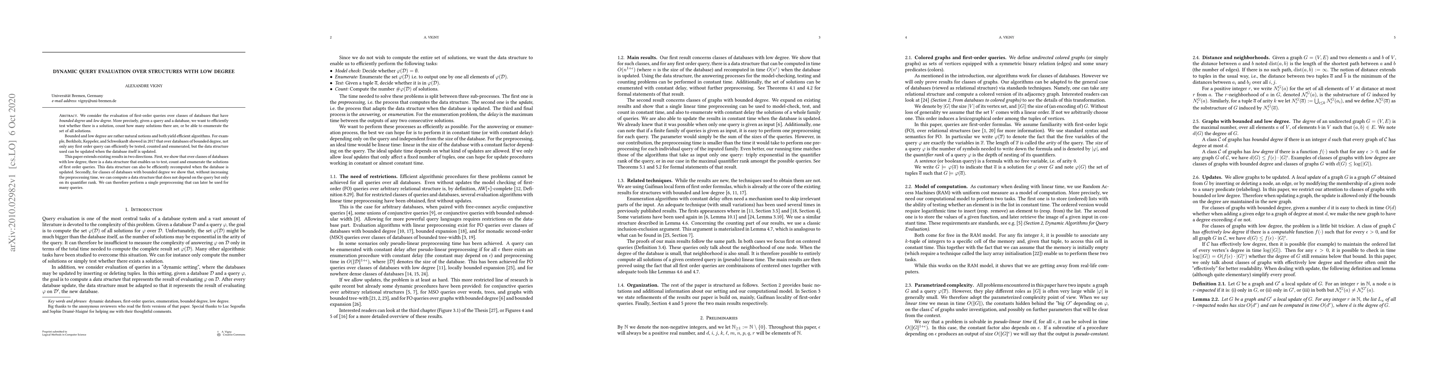 This paper presents efficient algorithms for evaluating first-order queries over structured databases with low degree, allowing for solution testing, counting, and enumeration. It also introduces a data structure that can be recomputed efficiently after database updates and demonstrates how to preprocess for multiple queries based on their quantifier rank without additional preprocessing time for bounded degree databases.