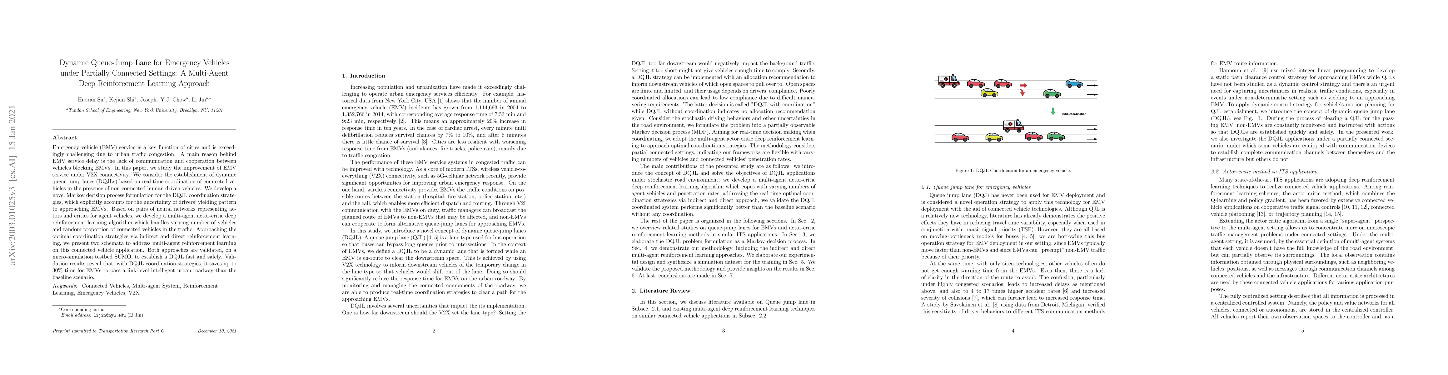 This paper proposes a dynamic queue-jump lane (DQJL) for emergency vehicles using multi-agent deep reinforcement learning under partially connected vehicle settings. The approach leverages real-time coordination of connected vehicles to reduce delays, validated on SUMO micro-simulation, showing up to 30% time savings for emergency vehicles.