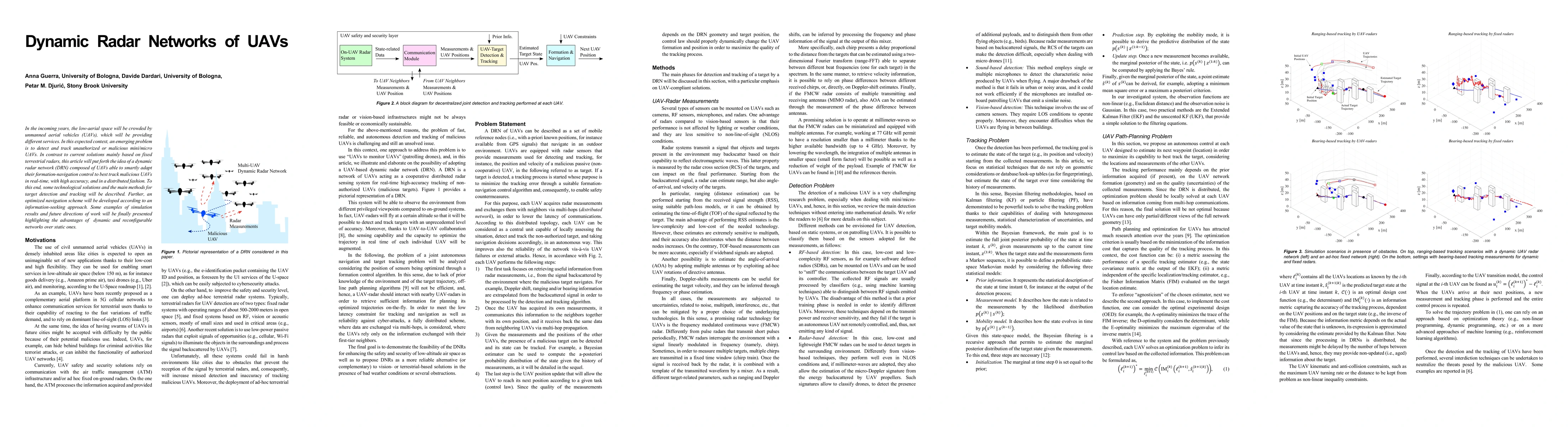 This paper proposes a dynamic radar network (DRN) of UAVs to detect and track malicious mini/micro UAVs in crowded low-aerial spaces. The DRN adapts its formation and navigation in real-time, using distributed methods for high-accuracy tracking, and an information-seeking approach for optimized navigation.