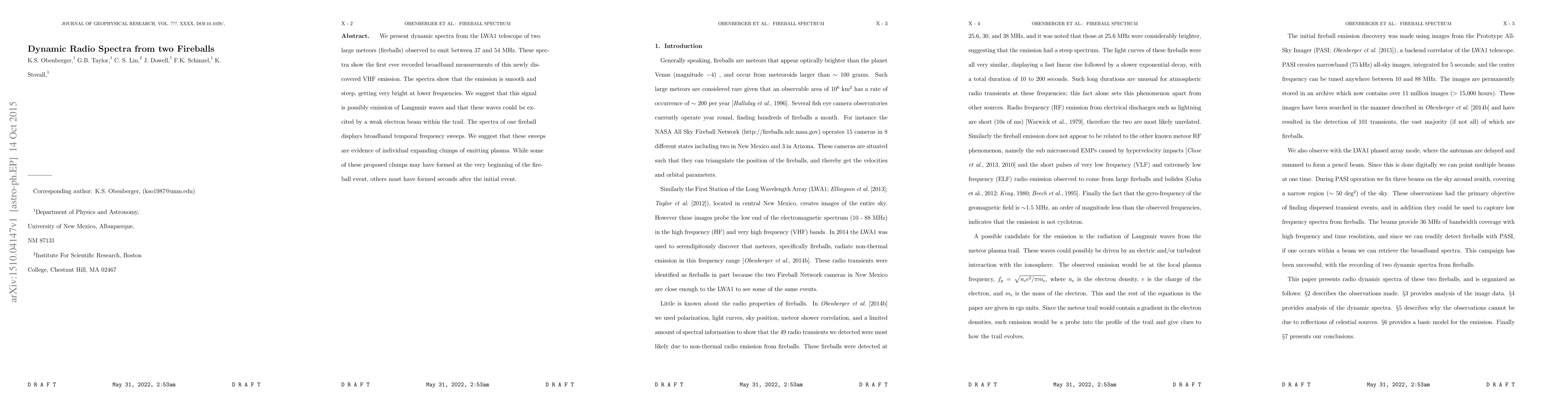 We present dynamic spectra from the LWA1 telescope of two large meteors (fireballs) observed to emit between 37 and 54 MHz. These spectra show the first ever recorded broadband measurements of this newly discovered VHF emission. The spectra show that the emission is smooth and steep, getting very bright at lower frequencies. We suggest that this signal is possibly emission of Langmuir waves and that these waves could be excited by a weak electron beam within the trail. The spectra of one fireball displays broadband temporal frequency sweeps. We suggest that these sweeps are evidence of individual expanding clumps of emitting plasma. While some of these proposed clumps may have formed at the very beginning of the fireball event, others must have formed seconds after the initial event.