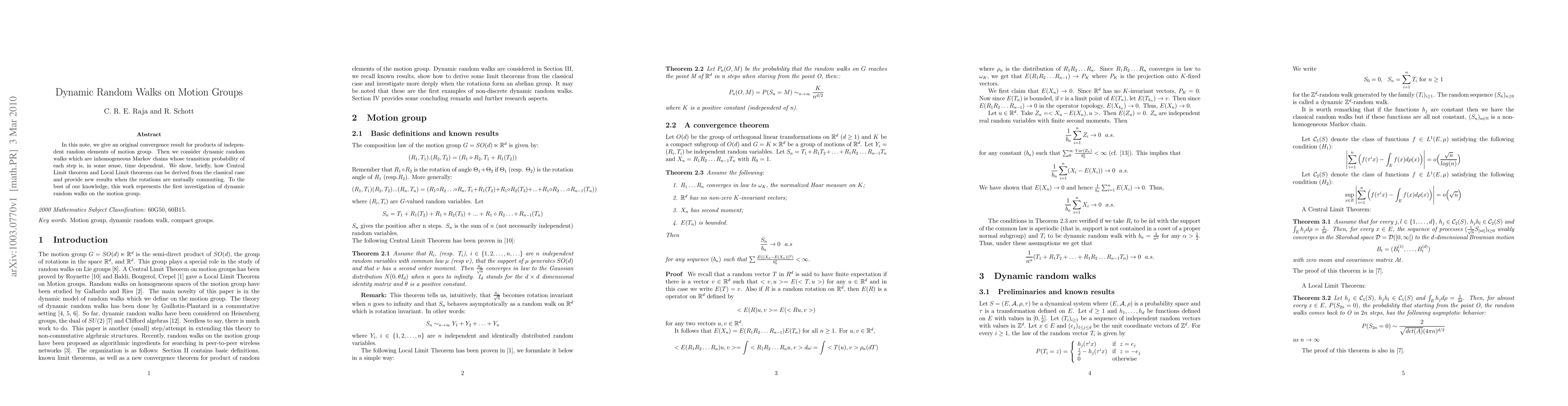 In this note, we give an original convergence result for products of independent random elements of motion group. Then we consider dynamic random walks which are inhomogeneous Markov chains whose transition probability of each step is, in some sense, time dependent. We show, briefly, how Central Limit theorem and Local Limit theorems can be derived from the classical case and provide new results when the rotations are mutually commuting. To the best of our knowledge, this work represents the first investigation of dynamic random walks on the motion group.
