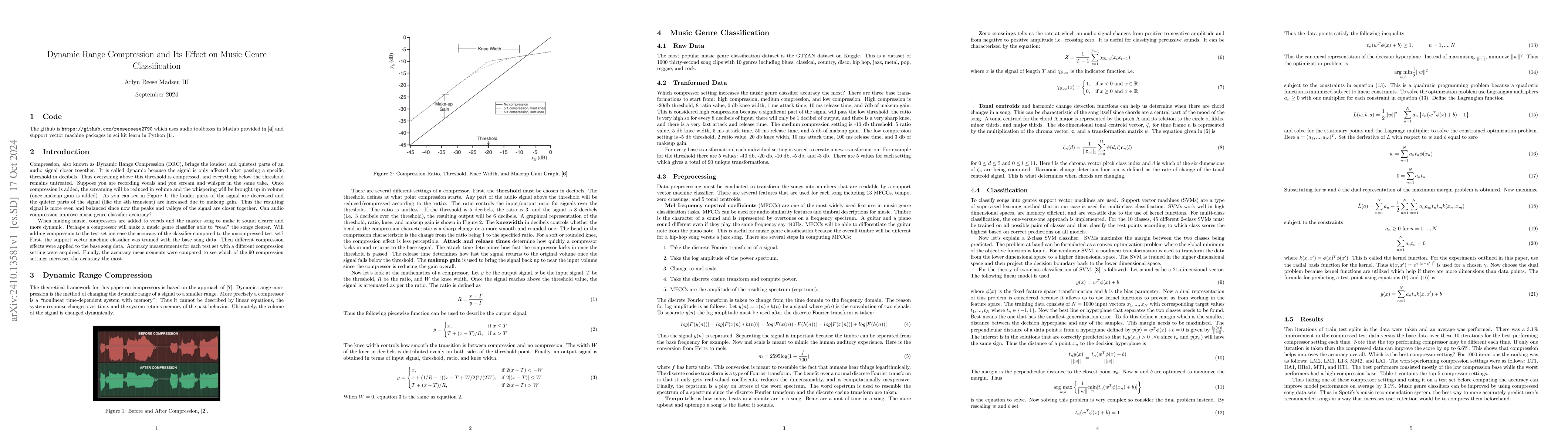 This paper investigates the impact of dynamic range compression (DRC) on music genre classification accuracy. By applying various compression settings to the test set of 200 songs, we aim to determine if compression can enhance the classifier's ability to discern distinct musical genres. A support vector machine (SVM) classifier was trained on the original, uncompressed dataset. The study explored the influence of threshold, ratio, knee width, attack time, release time, and makeup gain on classification performance. Our findings indicate that applying compression to the test set can indeed improve music genre classification accuracy on average by 3.1%. The optimal compression settings varied across experiments, suggesting that the effectiveness of compression depends on the training data of the model. A table of the top compression settings over 1000 train and test splits is provided. In conclusion, this research demonstrates that dynamic range compression can serve as a valuable preprocessing technique for enhancing music genre classification. The insights gained from this study can inform the development of more accurate and robust music recommendation systems.