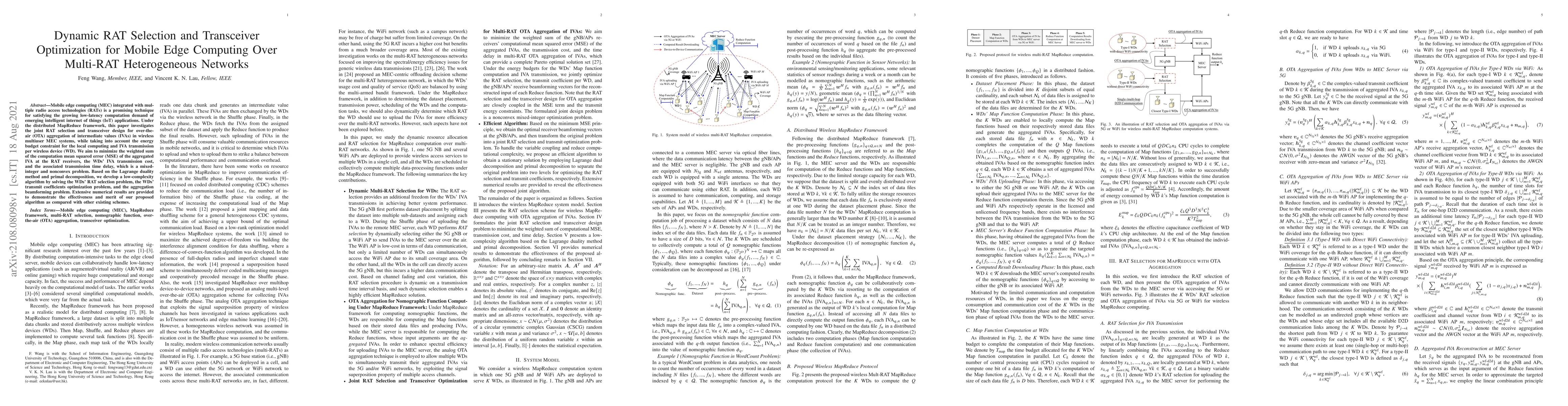 This paper proposes a new algorithm to optimize RAT selection and transceiver design for mobile edge computing in multi-RAT heterogeneous networks, aiming to minimize computation error, transmission cost, and delay. The proposed algorithm is shown to be effective in reducing errors and improving performance compared to existing schemes.
