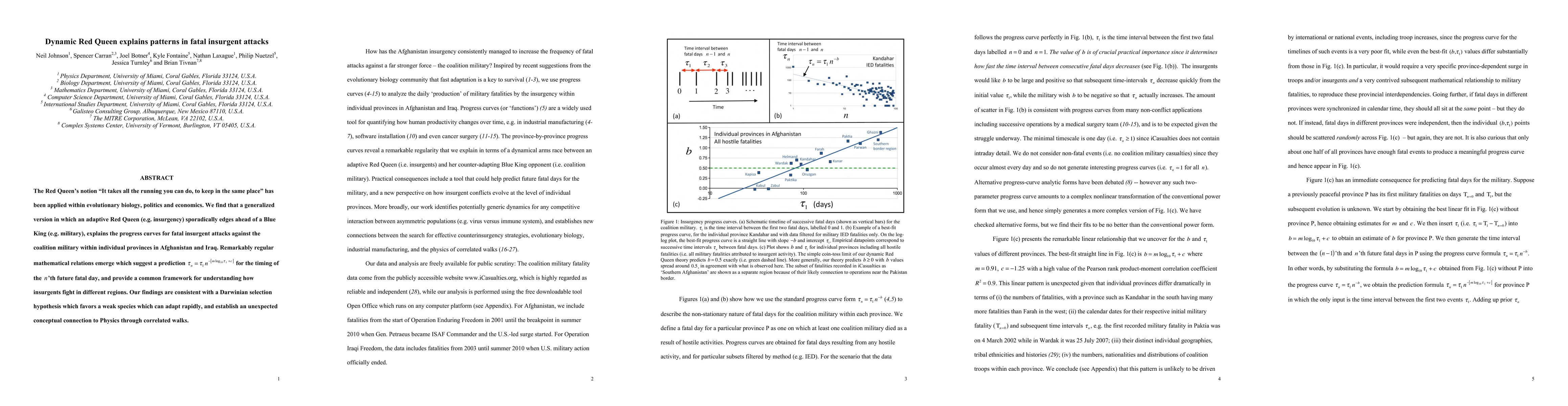 This paper applies the Red Queen dynamic to explain patterns in insurgent attacks, showing that insurgents adapt to military responses, leading to regular mathematical relations predicting future attack timings. The findings support a Darwinian selection model favoring rapid adaptation and link insurgent strategies to correlated walks in physics.