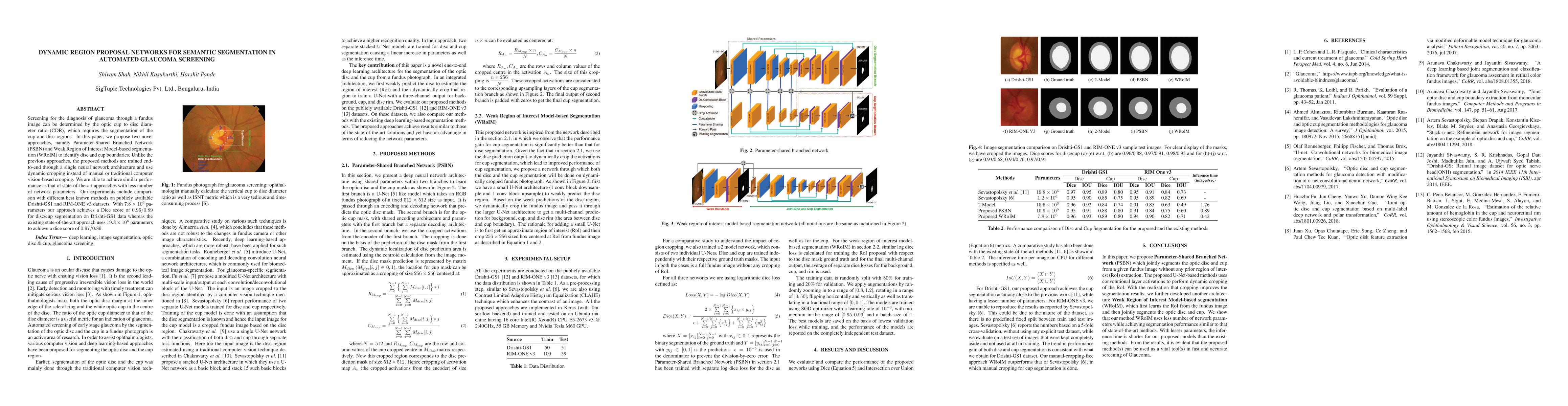 Screening for the diagnosis of glaucoma through a fundus image can be determined by the optic cup to disc diameter ratio (CDR), which requires the segmentation of the cup and disc regions. In this paper, we propose two novel approaches, namely Parameter-Shared Branched Network (PSBN) andWeak Region of Interest Model-based segmentation (WRoIM) to identify disc and cup boundaries. Unlike the previous approaches, the proposed methods are trained end-to-end through a single neural network architecture and use dynamic cropping instead of manual or traditional computer vision-based cropping. We are able to achieve similar performance as that of state-of-the-art approaches with less number of network parameters. Our experiments include comparison with different best known methods on publicly available Drishti-GS1 and RIM-ONE v3 datasets. With $7.8 \times 10^6$ parameters our approach achieves a Dice score of 0.96/0.89 for disc/cup segmentation on Drishti-GS1 data whereas the existing state-of-the-art approach uses $19.8\times 10^6$ parameters to achieve a dice score of 0.97/0.89.