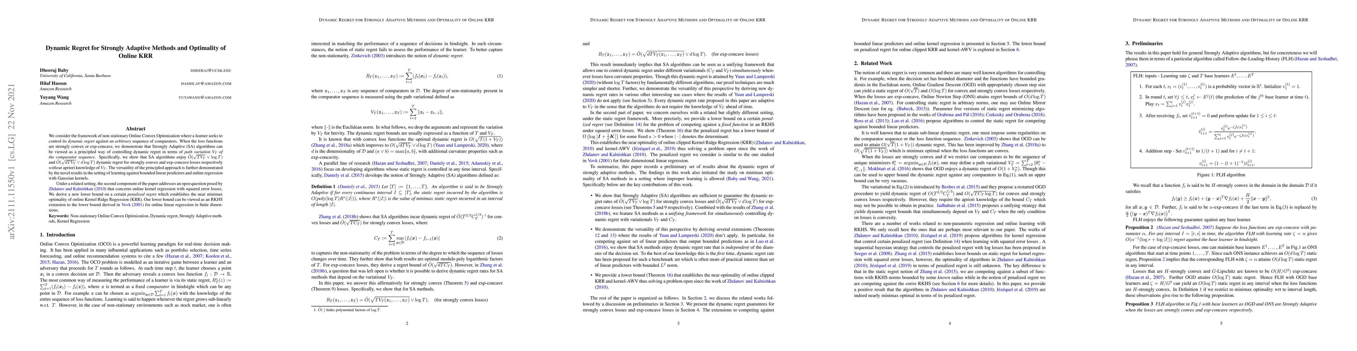 We consider the framework of non-stationary Online Convex Optimization where a learner seeks to control its dynamic regret against an arbitrary sequence of comparators. When the loss functions are strongly convex or exp-concave, we demonstrate that Strongly Adaptive (SA) algorithms can be viewed as a principled way of controlling dynamic regret in terms of path variation $V_T$ of the comparator sequence. Specifically, we show that SA algorithms enjoy $\tilde O(\sqrt{TV_T} \vee \log T)$ and $\tilde O(\sqrt{dTV_T} \vee d\log T)$ dynamic regret for strongly convex and exp-concave losses respectively without apriori knowledge of $V_T$. The versatility of the principled approach is further demonstrated by the novel results in the setting of learning against bounded linear predictors and online regression with Gaussian kernels. Under a related setting, the second component of the paper addresses an open question posed by Zhdanov and Kalnishkan (2010) that concerns online kernel regression with squared error losses. We derive a new lower bound on a certain penalized regret which establishes the near minimax optimality of online Kernel Ridge Regression (KRR). Our lower bound can be viewed as an RKHS extension to the lower bound derived in Vovk (2001) for online linear regression in finite dimensions.