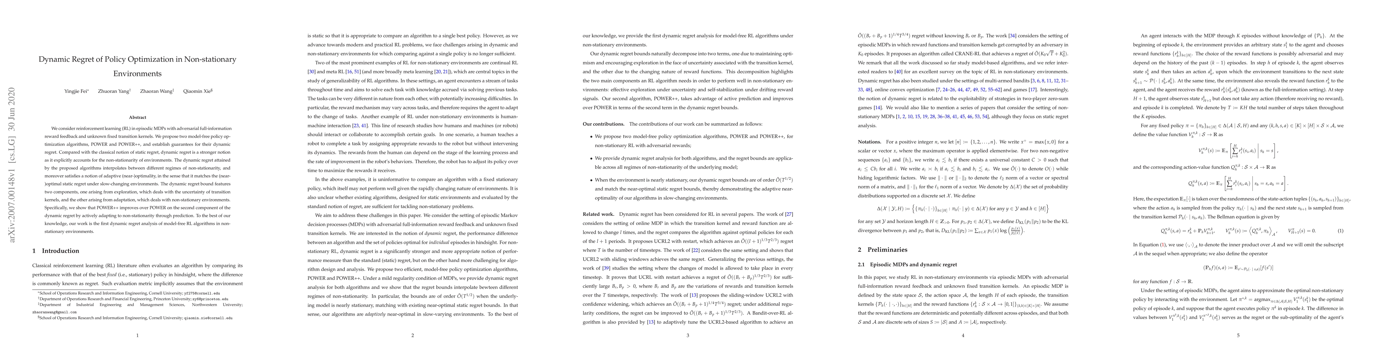 This paper proposes two model-free policy optimization algorithms, POWER and POWER++, for reinforcement learning in non-stationary environments, and establishes dynamic regret guarantees. The dynamic regret analysis, a stronger measure than static regret, captures the uncertainty of transition kernels and the adaptation to non-stationarity.