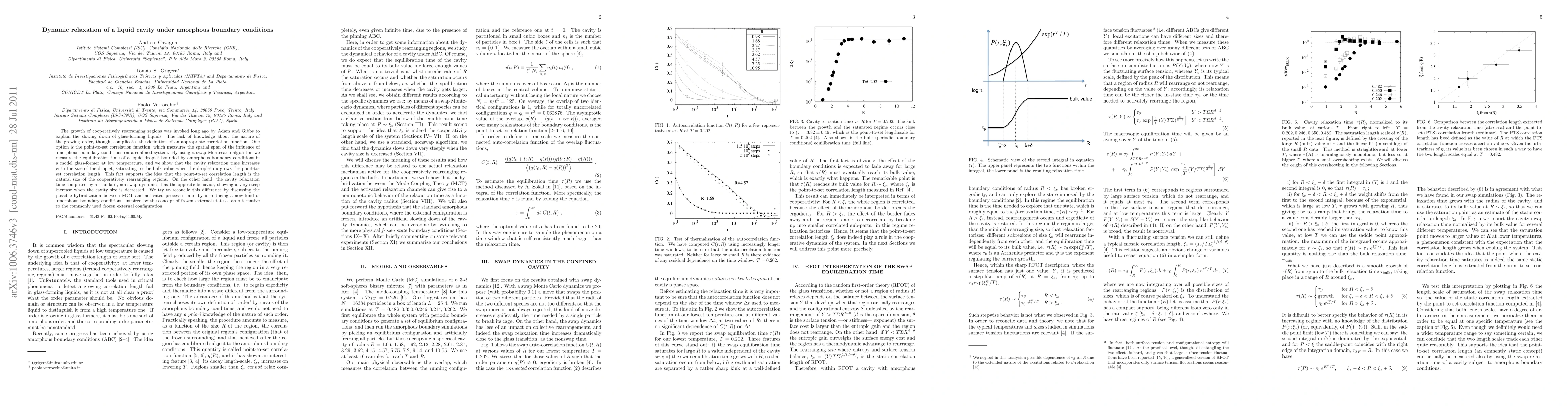 The growth of cooperatively rearranging regions was invoked long ago by Adam and Gibbs to explain the slowing down of glass-forming liquids. The lack of knowledge about the nature of the growing order, though, complicates the definition of an appropriate correlation function. One option is the point-to-set correlation function, which measures the spatial span of the influence of amorphous boundary conditions on a confined system. By using a swap Monte Carlo algorithm we measure the equilibration time of a liquid droplet bounded by amorphous boundary conditions in a model glass-former at low temperature, and we show that the cavity relaxation time increases with the size of the droplet, saturating to the bulk value when the droplet outgrows the point-to-set correlation length. This fact supports the idea that the point-to-set correlation length is the natural size of the cooperatively rearranging regions. On the other hand, the cavity relaxation time computed by a standard, nonswap dynamics, has the opposite behavior, showing a very steep increase when the cavity size is decreased. We try to reconcile this difference by discussing the possible hybridization between MCT and activated processes, and by introducing a new kind of amorphous boundary conditions, inspired by the concept of frozen external state as an alternative to the commonly used frozen external configuration.