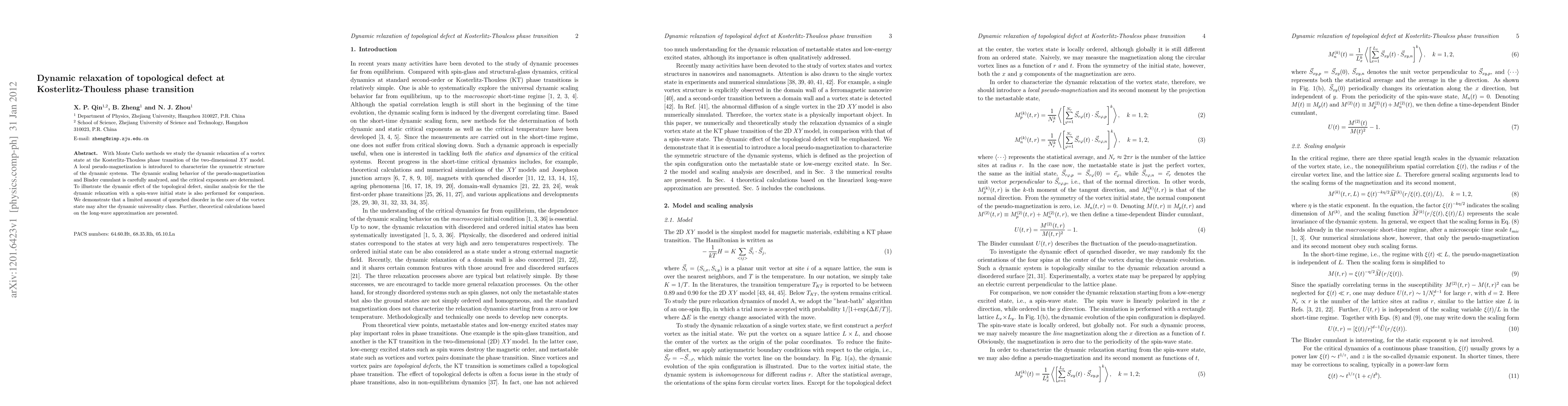 This research uses Monte Carlo methods to investigate the dynamic relaxation of vortex states during the Kosterlitz-Thouless phase transition in the 2D XY model, introducing a local pseudo-magnetization to characterize the system. The study analyzes dynamic scaling behavior and critical exponents, revealing that quenched disorder in vortex cores can change dynamic universality classes, supported by theoretical calculations based on long-wave approximation.