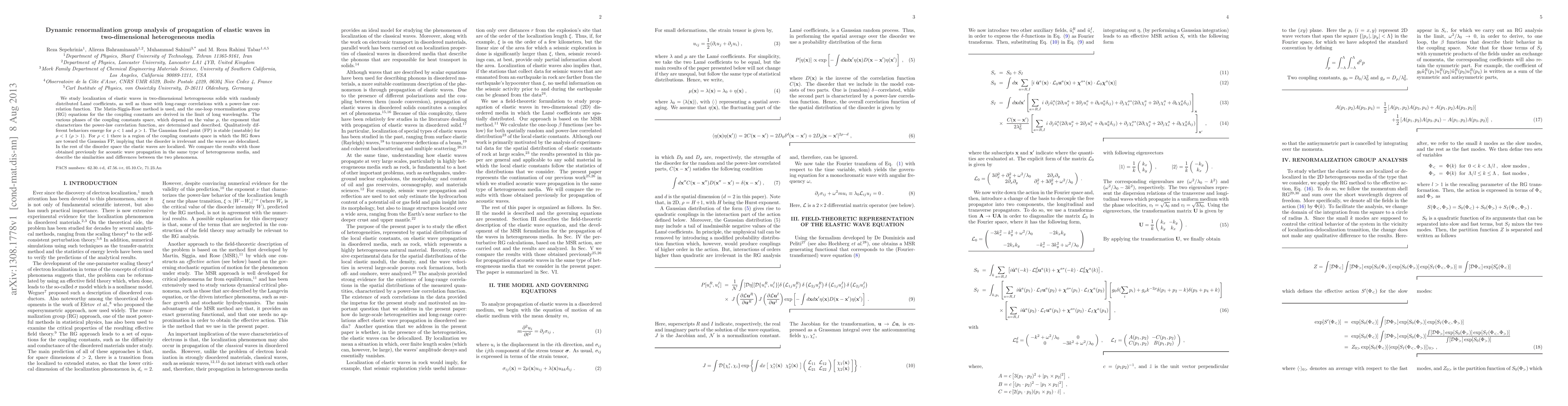 This paper employs dynamic renormalization group analysis to study the localization of elastic waves in two-dimensional heterogeneous solids, revealing distinct behaviors based on the correlation function's exponent. The Gaussian fixed point is stable for low correlation, indicating delocalized waves, while higher correlations lead to localization.