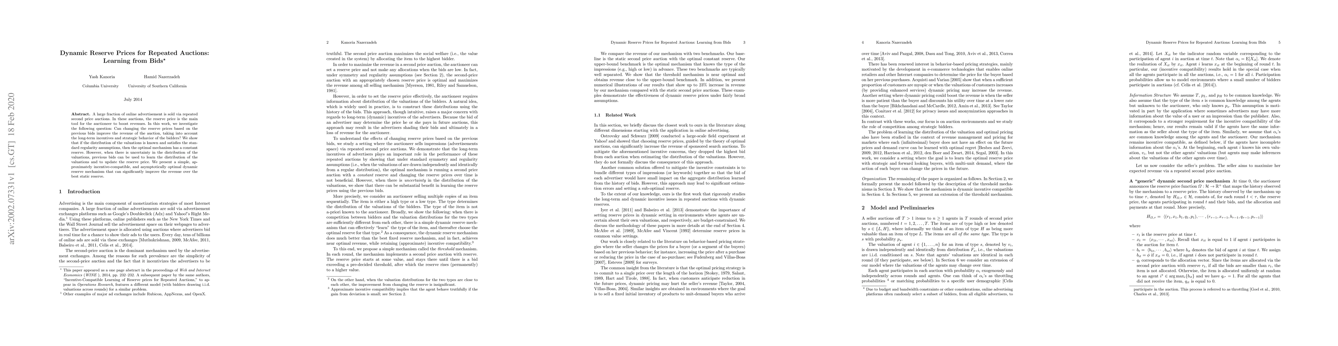 This paper explores dynamic reserve pricing in repeated second-price auctions for online advertisement, demonstrating that adjusting reserve prices based on previous bids can enhance revenue, especially under uncertainty about bidders' valuation distributions. The proposed dynamic mechanism is approximately incentive-compatible and asymptotically optimal.