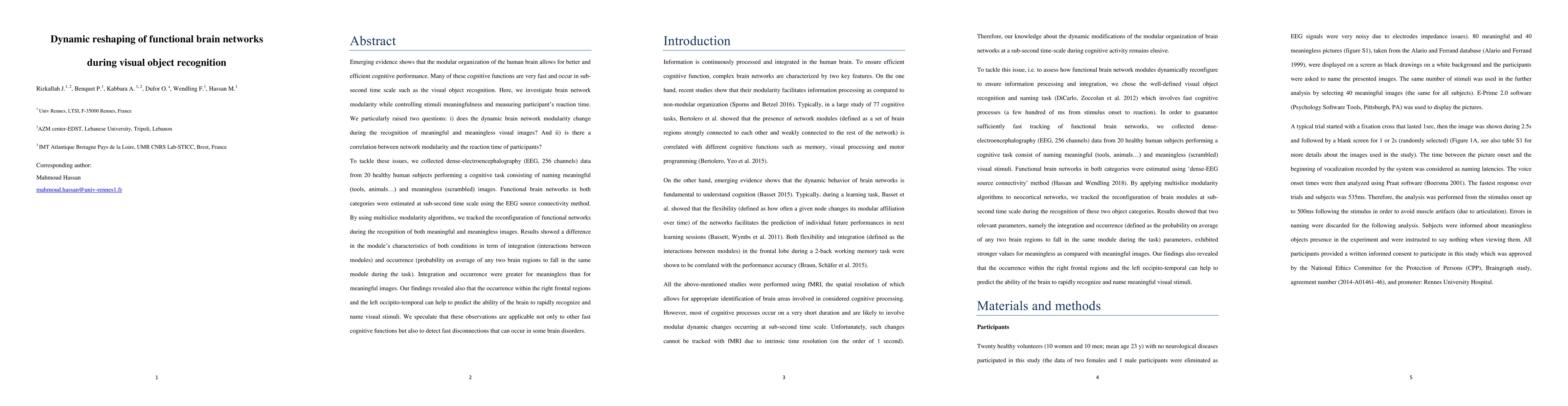 Emerging evidence shows that the modular organization of the human brain allows for better and efficient cognitive performance. Many of these cognitive functions are very fast and occur in subsecond time scale such as the visual object recognition. Here, we investigate brain network modularity while controlling stimuli meaningfulness and measuring participant reaction time. We particularly raised two questions: i) does the dynamic brain network modularity change during the recognition of meaningful and meaningless visual images? And ii) is there a correlation between network modularity and the reaction time of participants? To tackle these issues, we collected dense electroencephalography (EEG, 256 channels) data from 20 healthy human subjects performing a cognitive task consisting of naming meaningful (tools, animals) and meaningless (scrambled) images. Functional brain networks in both categories were estimated at subsecond time scale using the EEG source connectivity method. By using multislice modularity algorithms, we tracked the reconfiguration of functional networks during the recognition of both meaningful and meaningless images. Results showed a difference in the module characteristics of both conditions in term of integration (interactions between modules) and occurrence (probability on average of any two brain regions to fall in the same module during the task). Integration and occurrence were greater for meaningless than for meaningful images. Our findings revealed also that the occurrence within the right frontal regions and the left occipito-temporal can help to predict the ability of the brain to rapidly recognize and name visual stimuli. We speculate that these observations are applicable not only to other fast cognitive functions but also to detect fast disconnections that can occur in some brain disorders.