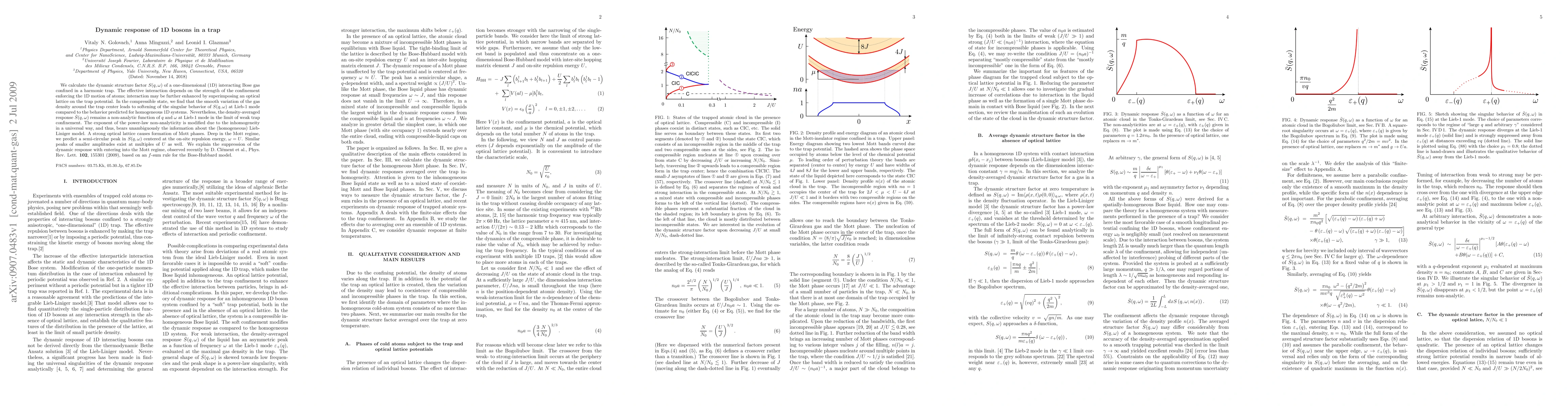We calculate the dynamic structure factor S(q,omega) of a one-dimensional (1D) interacting Bose gas confined in a harmonic trap. The effective interaction depends on the strength of the confinement enforcing the 1D motion of atoms; interaction may be further enhanced by superimposing an optical lattice on the trap potential. In the compressible state, we find that the smooth variation of the gas density around the trap center leads to softening of the singular behavior of S(q,omega) at Lieb-1 mode compared to the behavior predicted for homogeneous 1D systems. Nevertheless, the density-averaged response remains a non-analytic function of q and omega at Lieb-1 mode in the limit of weak trap confinement. The exponent of the power-law non-analyticity is modified due to the inhomogeneity in a universal way, and thus, bears unambiguously the information about the (homogeneous) Lieb-Liniger model. A strong optical lattice causes formation of Mott phases. Deep in the Mott regime, we predict a semi-circular peak in S(q,\omega) centered at the on-site repulsion energy, omega=U. Similar peaks of smaller amplitudes exist at multiples of U as well. We explain the suppression of the dynamic response with entering into the Mott regime, observed recently by D. Clement et al., Phys. Rev. Lett. v. 102, p. 155301 (2009), based on an f-sum rule for the Bose-Hubbard model.