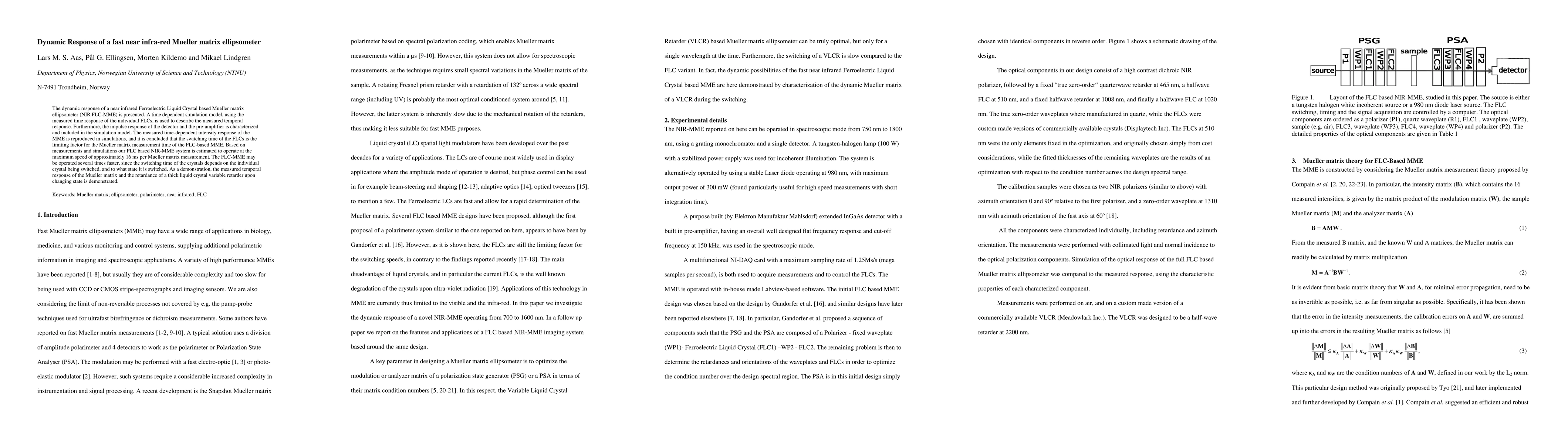 This paper investigates the dynamic response of a near-infrared Ferroelectric Liquid Crystal based Mueller matrix ellipsometer (NIR FLC-MME), identifying the switching time of FLCs as the limiting factor for measurement speed, estimated at 16 ms per measurement. The study demonstrates the system's potential for faster operation based on individual crystal switching times.