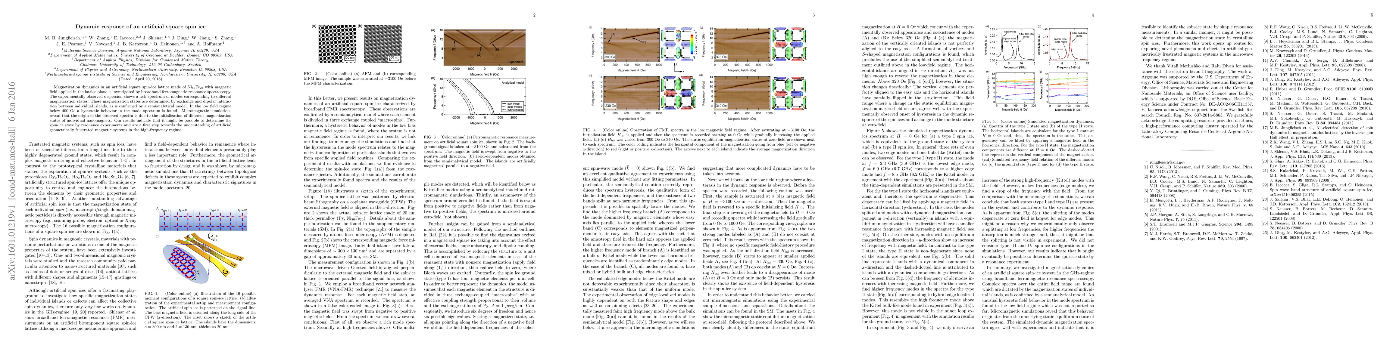 This paper investigates the magnetization dynamics in an artificial square spin-ice lattice via broadband ferromagnetic resonance spectroscopy, revealing a spectrum of modes linked to different magnetization states due to exchange and dipolar interactions. The study indicates a hysteretic behavior in the low field regime, suggesting the potential to determine spin-ice states through resonance experiments.