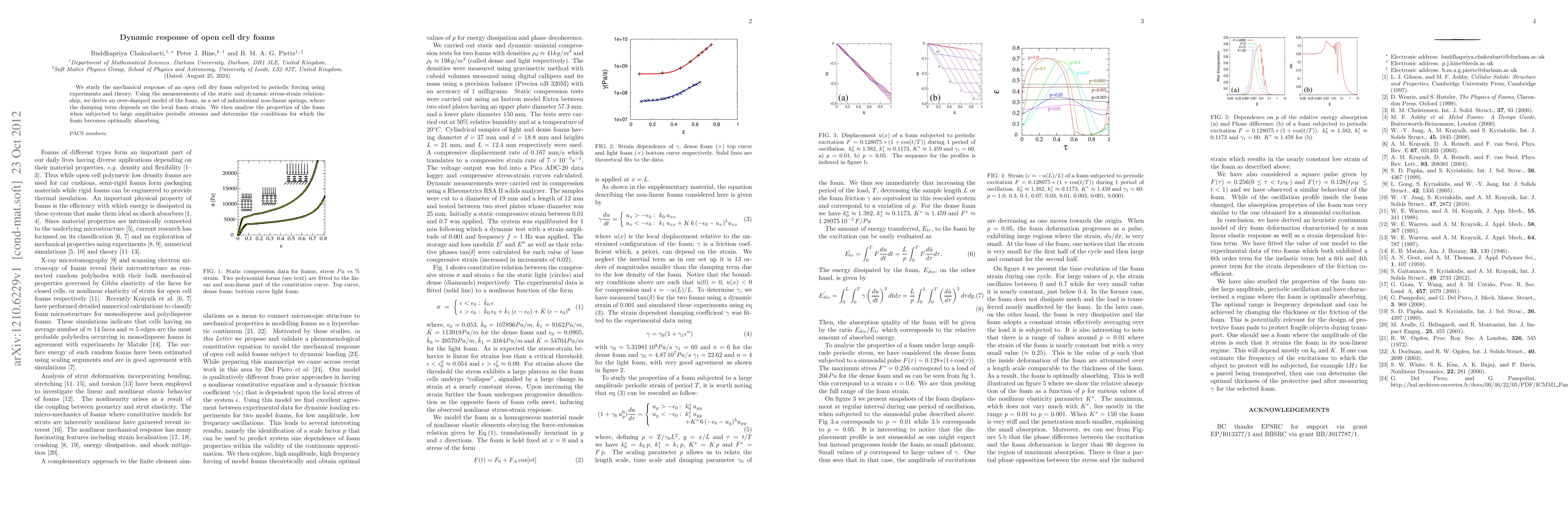 Researchers studied how open cell dry foams respond to periodic stress and found conditions for optimal absorption, using a model of infinitesimal non-linear springs with strain-dependent damping.