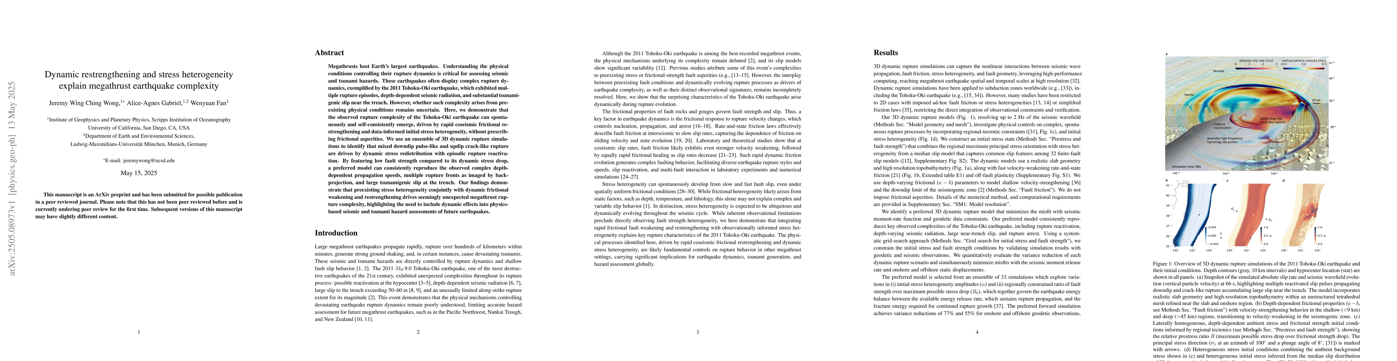 The paper presents a novel approach to understanding megathrust earthquake complexity by focusing on dynamic restrengthening and stress heterogeneity, without the need for prescribed frictional asperities.