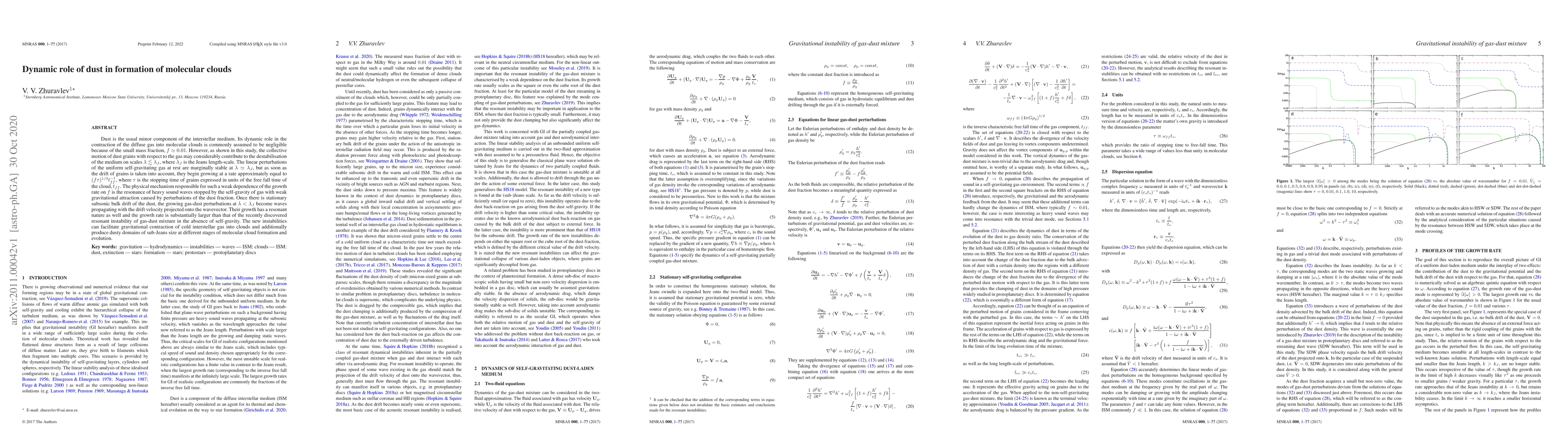 This study reveals that dust grains, despite their small mass fraction, play a significant role in the formation of molecular clouds by destabilizing the interstellar medium through resonant interactions, leading to the growth of perturbations and facilitating gravitational contraction. The collective motion of dust enhances the instability, contributing to the formation of sub-Jeans size dusty domains.