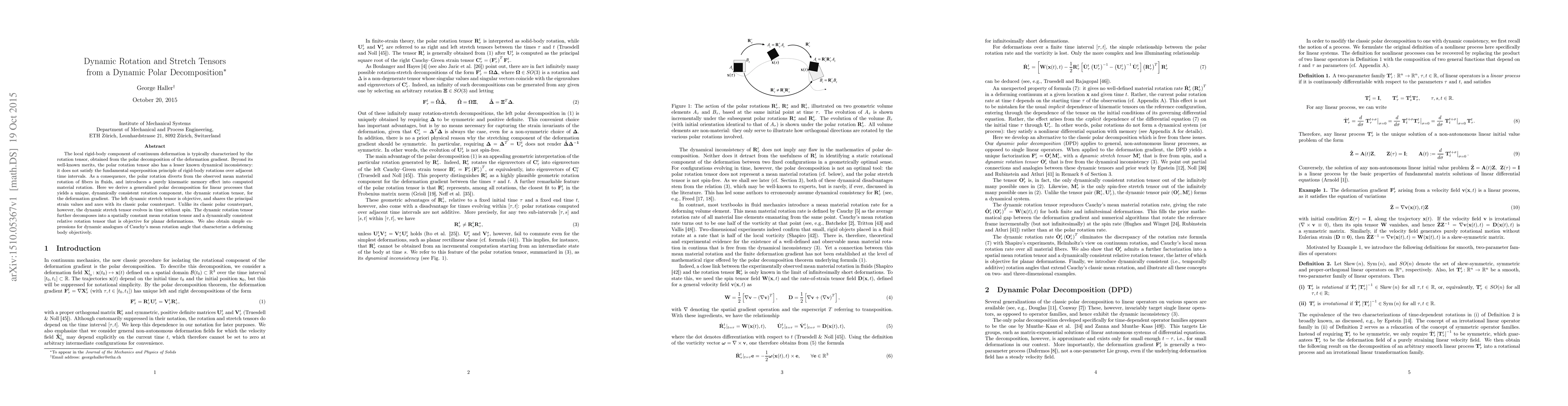 The local rigid-body component of continuum deformation is typically characterized by the rotation tensor, obtained from the polar decomposition of the deformation gradient. Beyond its well-known merits, the polar rotation tensor also has a lesser known dynamical inconsistency: it does not satisfy the fundamental superposition principle of rigid-body rotations over adjacent time intervals. As a consequence, the polar rotation diverts from the observed mean material rotation of fibers in fluids, and introduces a purely kinematic memory effect into computed material rotation. Here we derive a generalized polar decomposition for linear processes that yields a unique, dynamically consistent rotation component, the dynamic rotation tensor, for the deformation gradient. The left dynamic stretch tensor is objective, and shares the principal strain values and axes with its classic polar counterpart. Unlike its classic polar counterpart, however, the dynamic stretch tensor evolves in time without spin. The dynamic rotation tensor further decomposes into a spatially constant mean rotation tensor and a dynamically consistent relative rotation tensor that is objective for planar deformations. We also obtain simple expressions for dynamic analogues of Cauchy's mean rotation angle that characterize a deforming body objectively.
