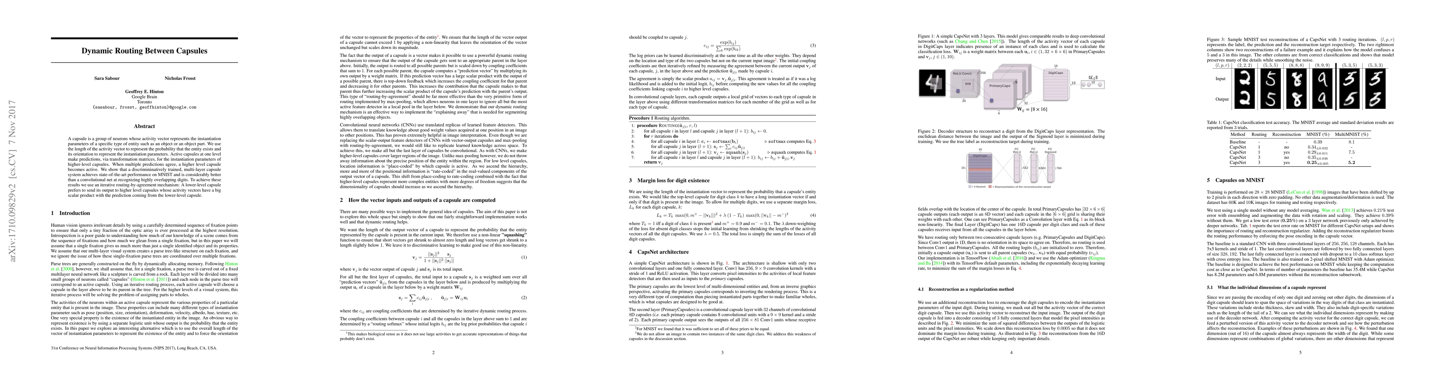 This paper proposes a dynamic routing mechanism between capsules, where capsules represent object or part entities, and uses an iterative routing-by-agreement method to achieve state-of-the-art performance on MNIST, outperforming convolutional networks in recognizing overlapping digits.