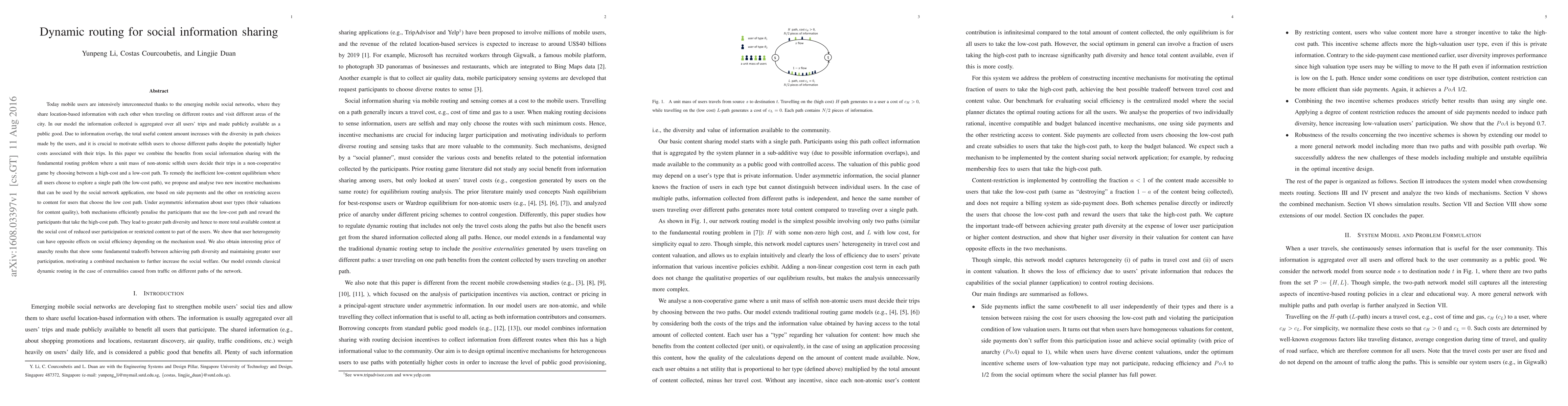 This paper explores dynamic routing in mobile social networks where users share location-based information. It proposes incentive mechanisms to motivate users to choose diverse paths, thereby increasing the overall useful content, and analyzes the tradeoffs between path diversity and user participation through price of anarchy results.