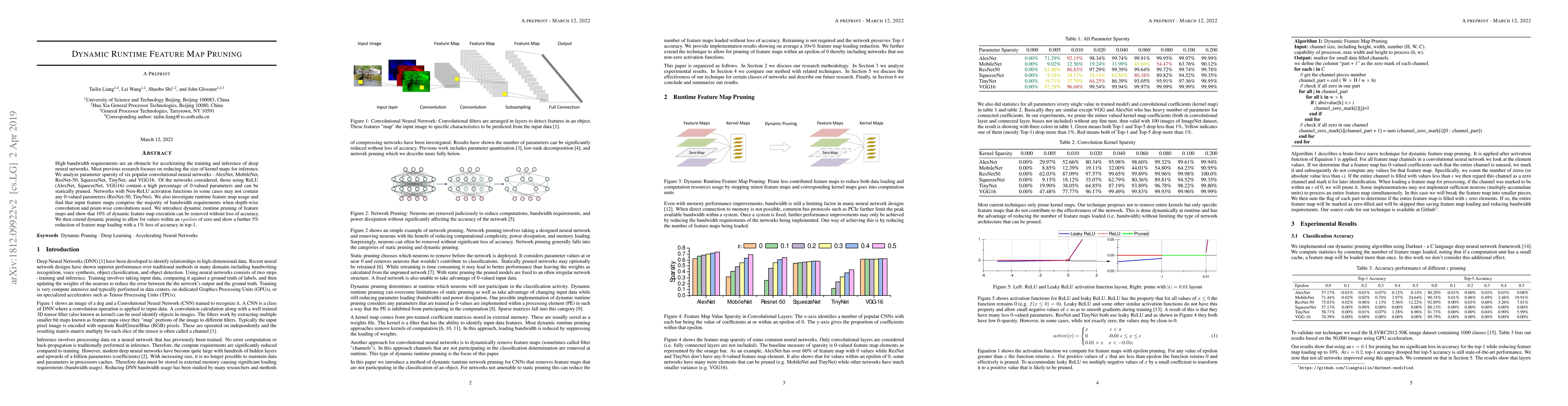 High bandwidth requirements are an obstacle for accelerating the training and inference of deep neural networks. Most previous research focuses on reducing the size of kernel maps for inference. We analyze parameter sparsity of six popular convolutional neural networks - AlexNet, MobileNet, ResNet-50, SqueezeNet, TinyNet, and VGG16. Of the networks considered, those using ReLU (AlexNet, SqueezeNet, VGG16) contain a high percentage of 0-valued parameters and can be statically pruned. Networks with Non-ReLU activation functions in some cases may not contain any 0-valued parameters (ResNet-50, TinyNet). We also investigate runtime feature map usage and find that input feature maps comprise the majority of bandwidth requirements when depth-wise convolution and point-wise convolutions used. We introduce dynamic runtime pruning of feature maps and show that 10% of dynamic feature map execution can be removed without loss of accuracy. We then extend dynamic pruning to allow for values within an epsilon of zero and show a further 5% reduction of feature map loading with a 1% loss of accuracy in top-1.