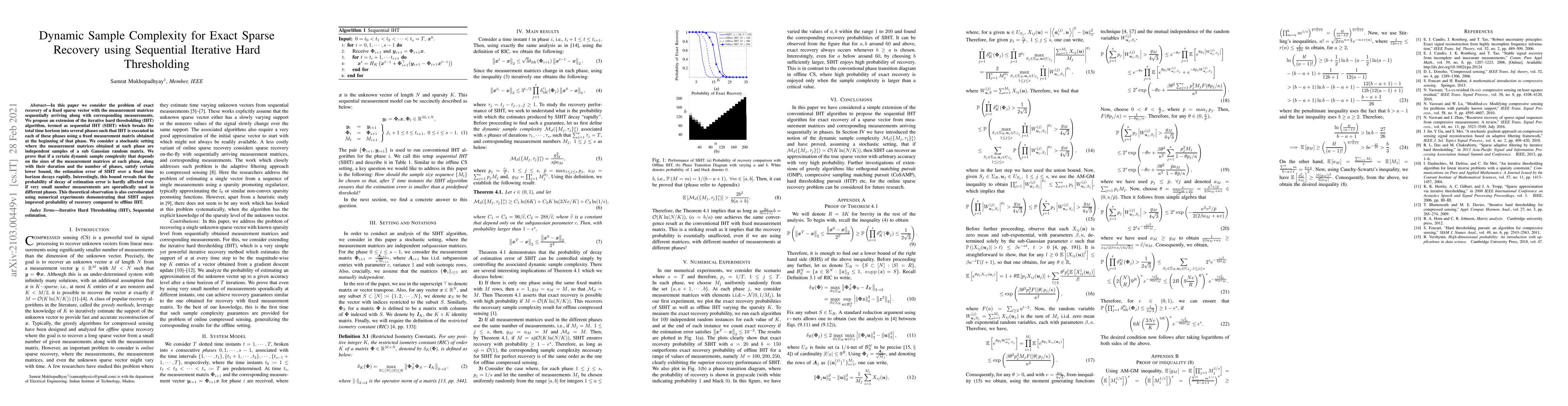 The paper introduces the Sequential Iterative Hard Thresholding (SIHT) algorithm and provides theoretical guarantees for its performance in exact sparse recovery under a dynamic sample complexity condition.