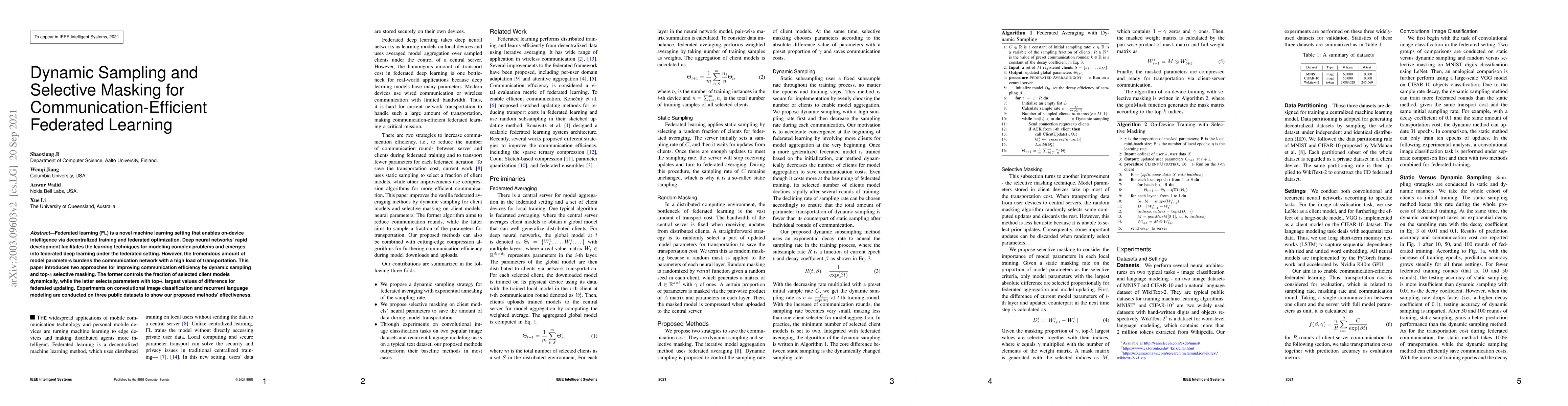 This paper proposes dynamic sampling and top-$k$ selective masking to enhance communication efficiency in federated learning. These methods aim to reduce the communication load by selectively updating only the most significant model parameters, demonstrated through experiments on image classification and language modeling.
