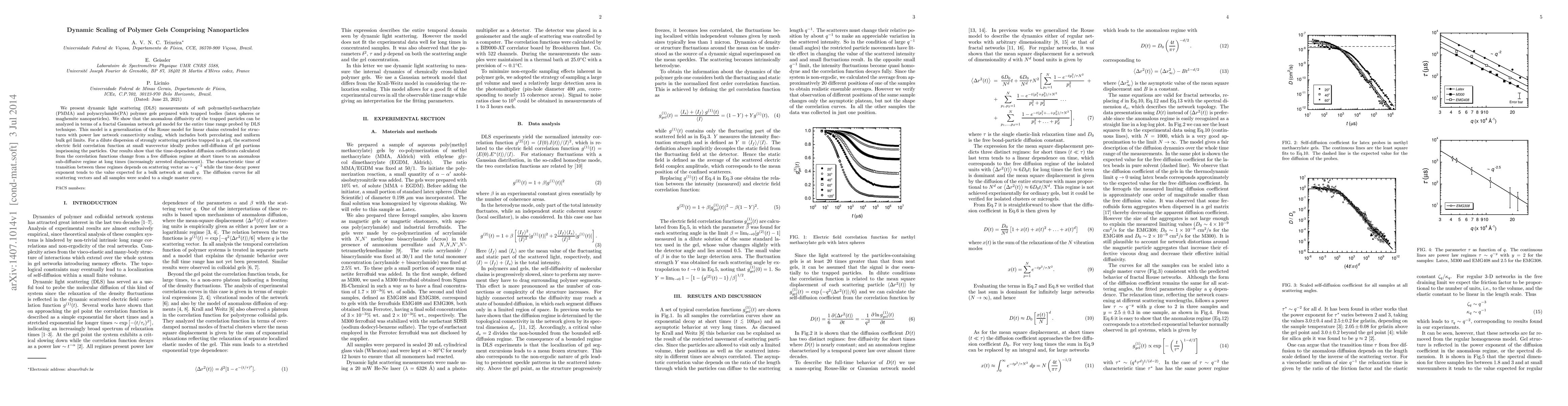 We present dynamic light scattering (DLS) measurements of soft polymethyl-methacrylate (PMMA) and polyacrylamide(PA) polymer gels prepared with trapped bodies (latex spheres or maghemite nanoparticles). We show that the anomalous diffusivity of the trapped particles can be analyzed in terms of a fractal Gaussian network gel model for the entire time range probed by DLS technique. This model is a generalization of the Rouse model for linear chains extended for structures with power law network connectivity scaling, which includes both percolating and uniform bulk gel limits. For a dilute dispersion of strongly scattering particles trapped in a gel, the scattered electric field correlation function at small wavevector ideally probes self-diffusion of gel portions imprisoning the particles. Our results show that the time-dependent diffusion coefficients calculated from the correlation functions change from a free diffusion regime at short times to an anomalous sub-diffusive regime at long times (increasingly arrested displacement). The characteristic time of transition between these regimes depends on scattering vector as $\sim q^{-2}$ while the time decay power exponent tends to the value expected for a bulk network at small $q$. The diffusion curves for all scattering vectors and all samples were scaled to a single master curve.